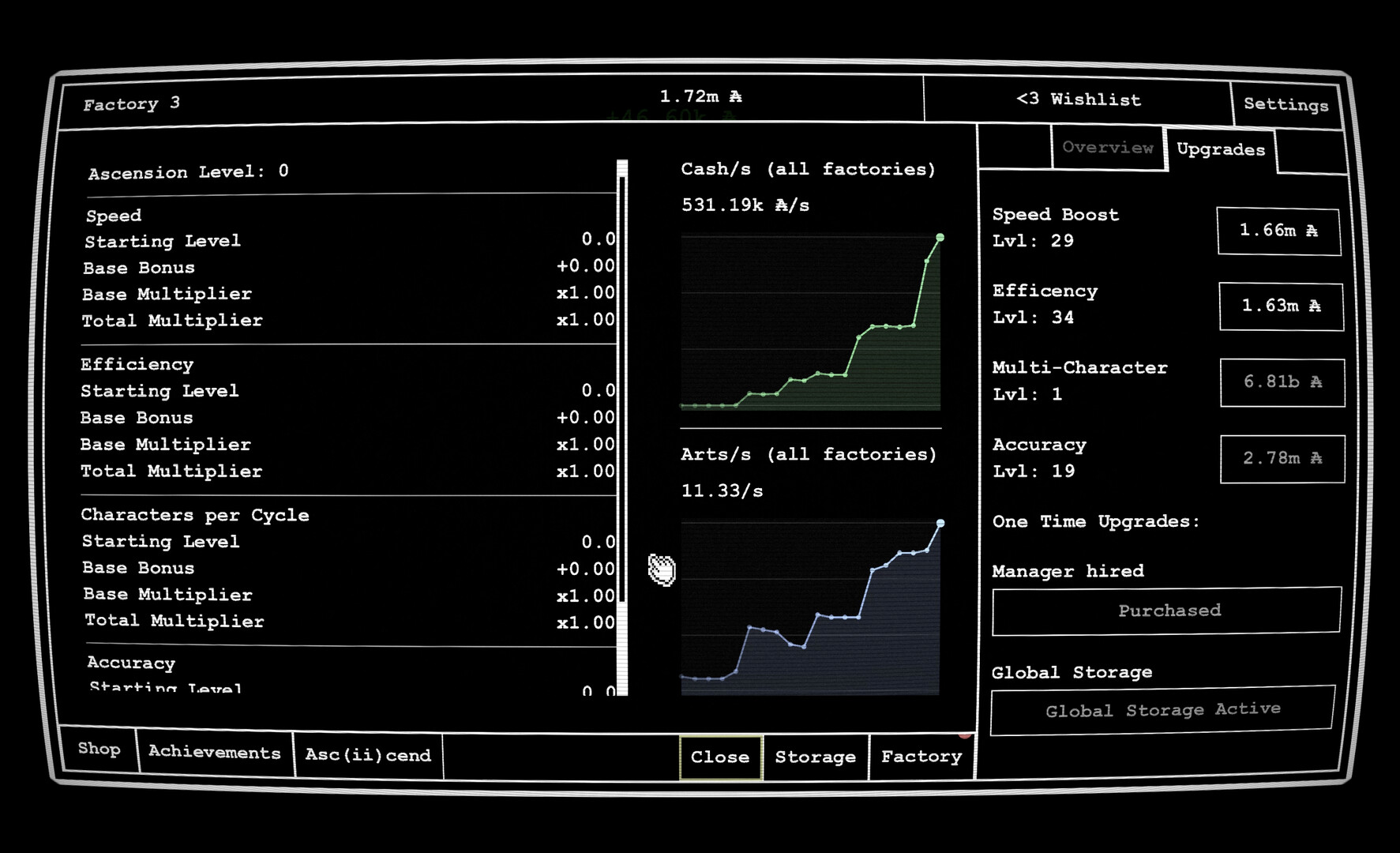 Immerse yourself in the world of ASCII art. Create works of art from characters. Build factories, upgrade them, and expand your production capacity. Invest in blueprints and reach milestones to earn bonuses. Use the ascension system for additional benefits.