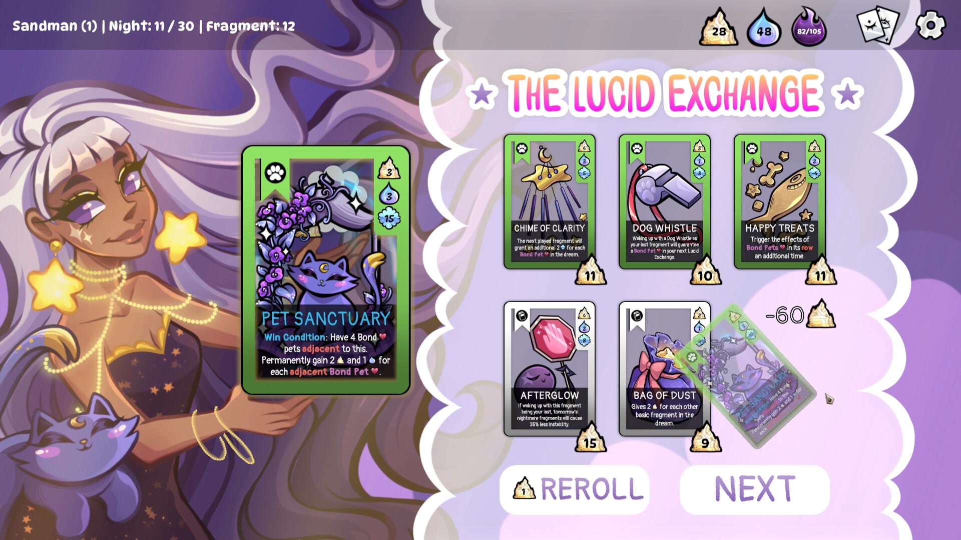 Bag of Dreams is a cozy indie roguelike with deckbuilder mechanics and high replayability. Draw cards, create powerful synergies, and expand your dream slots while avoiding nightmares in this strategic, relaxing card-game filled with adorable art.