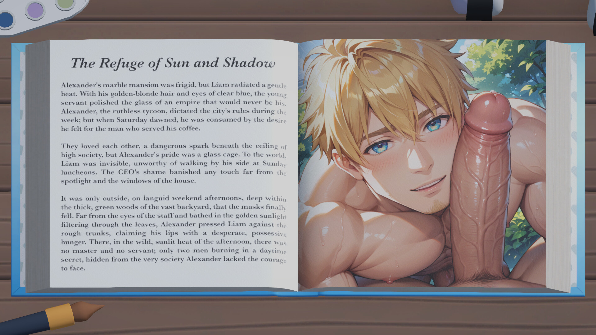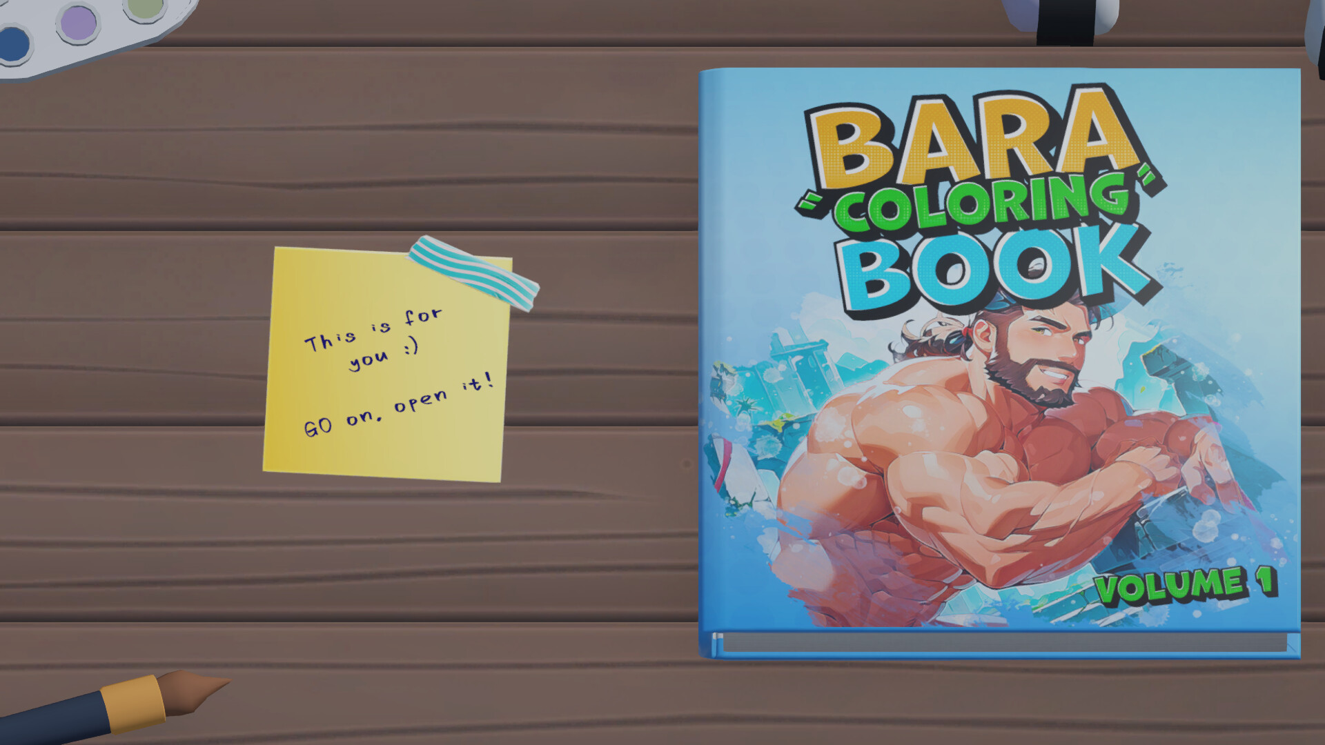 A friend gave you a rather... special coloring book. Relax and unleash your creativity in Bara Coloring Book, bringing illustrations of strong, handsome men to life. Color engaging scenes and unlock the intimate stories behind each character!