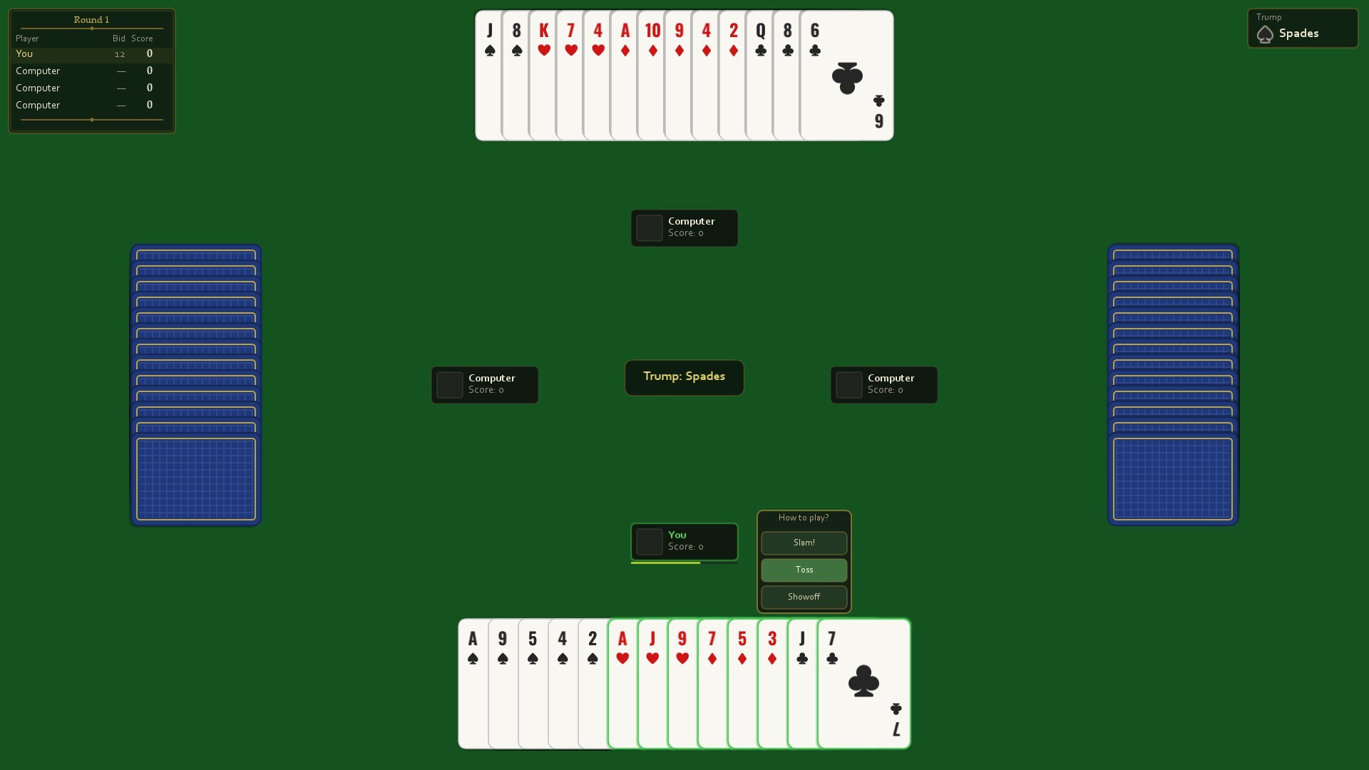 A classic Turkish trick-taking card game for 1-4 players. Play Klasik Batak or Eşli Batak (Partnership) against AI opponents or with friends online through Steam multiplayer. Bid, choose trump, and outplay your rivals.