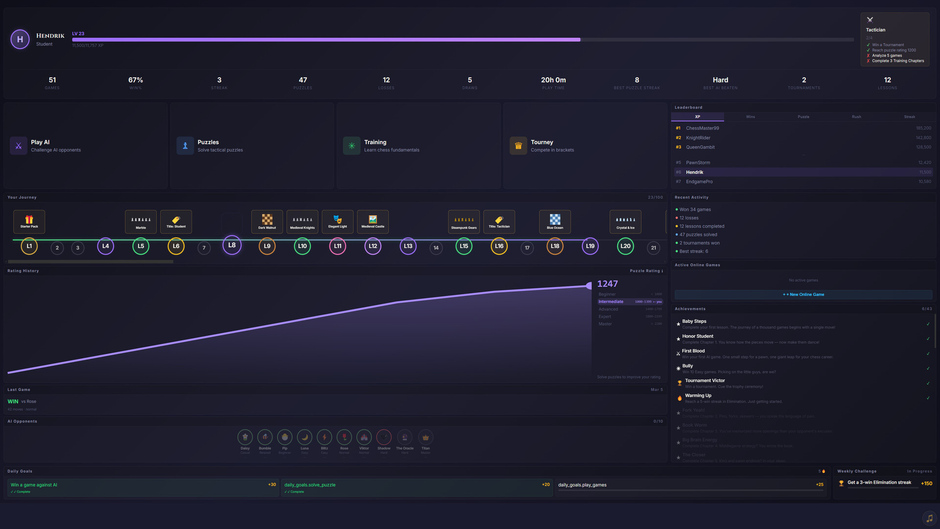 The complete chess experience. From first move to grandmaster. Learn through structured training, compete in tournaments, and challenge players worldwide. One game, every level.