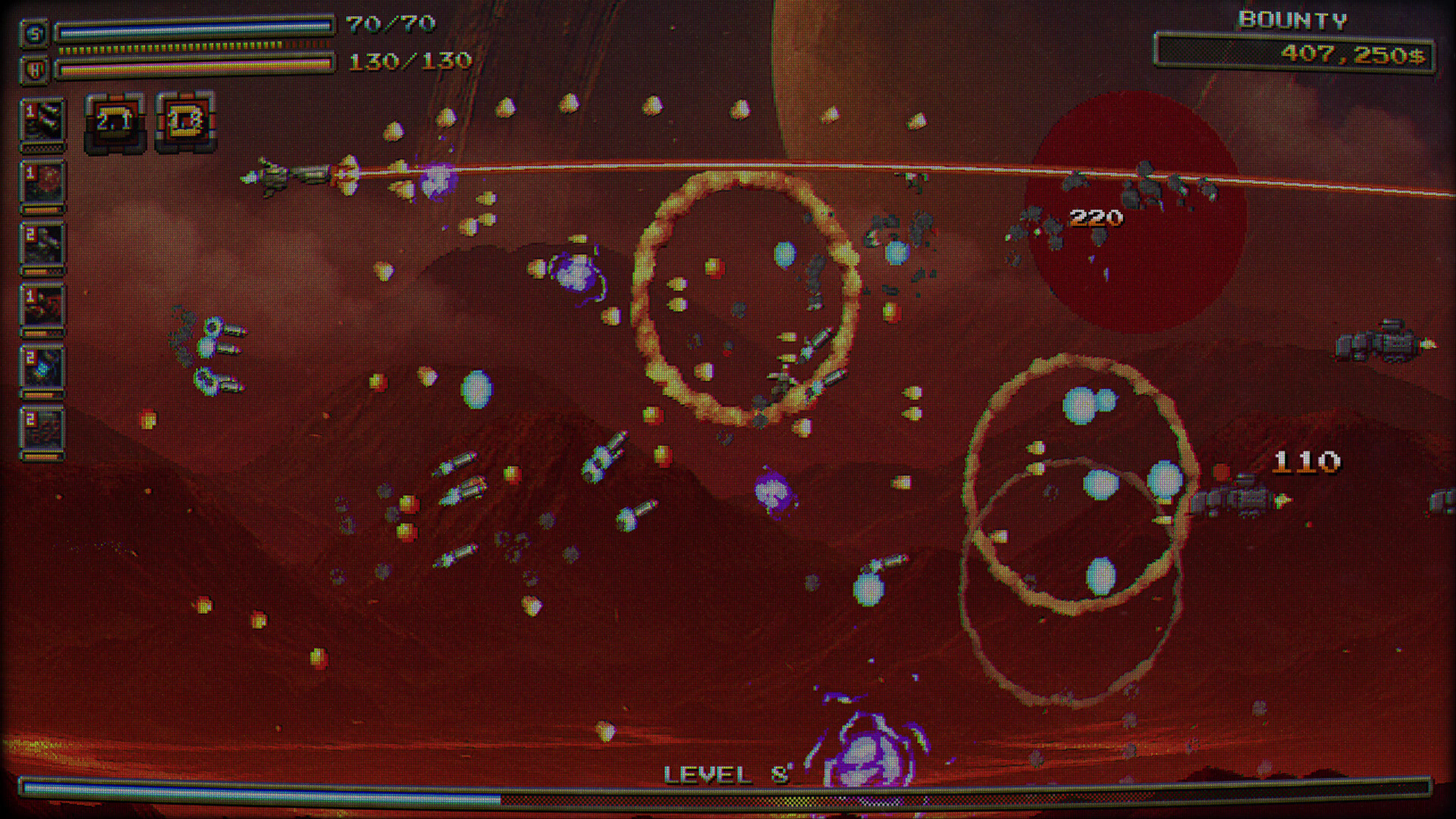 A retro-inspired 2D bullet hell roguelite where you pilot a customizable ship, scavenge enemy cores to upgrade your arsenal, and chase bounties across a high-stakes space rogue odyssey.