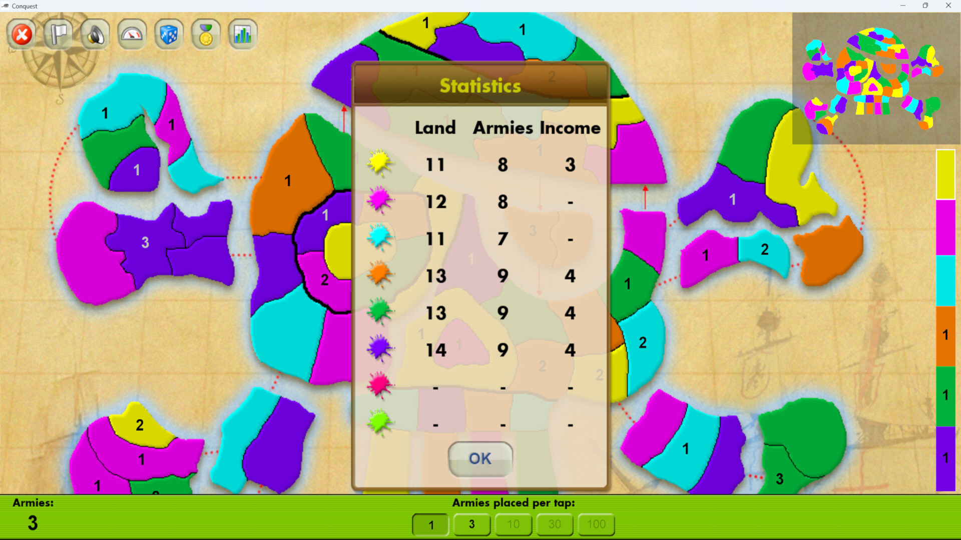 Conquest is a strategy board game where you fight against up to 7 computer or human controlled opponents to take over the world before you are eliminated by your enemies. The results of combat are calculated using dice throws for attackers and defenders.