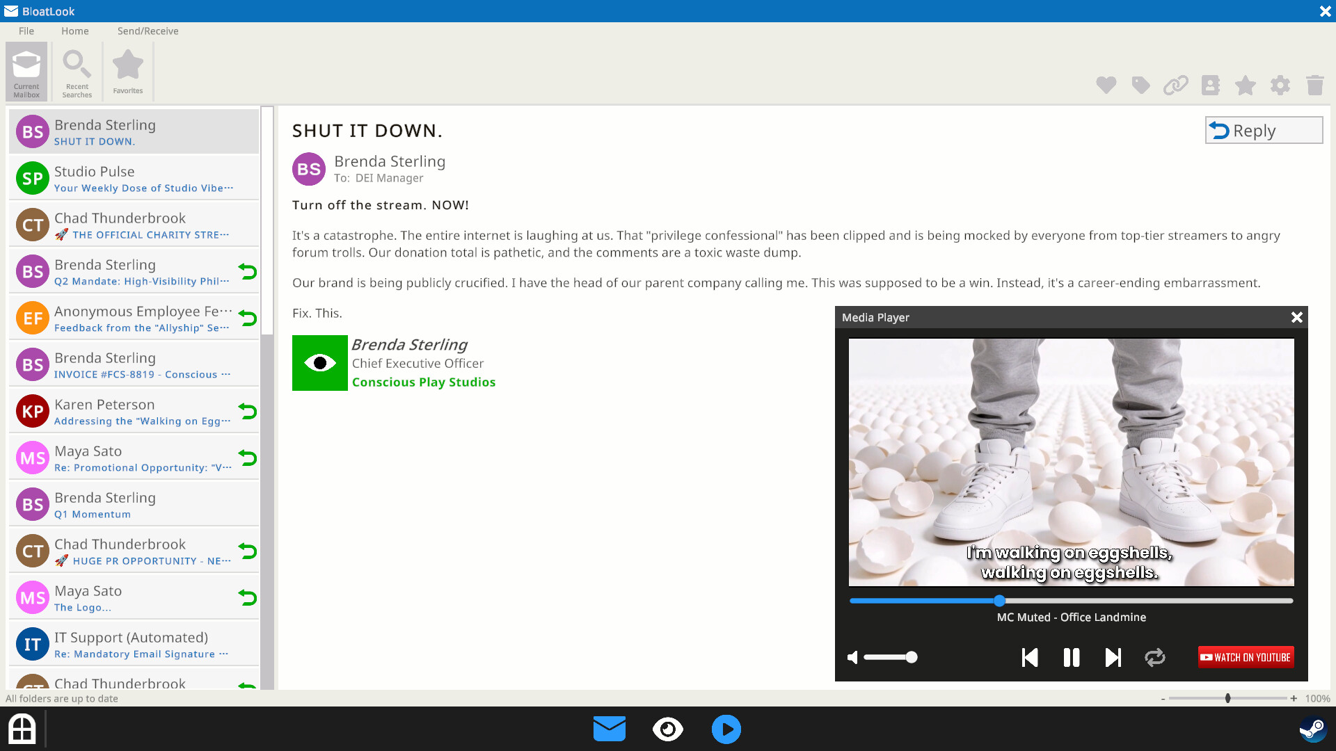 Ruin a game studio with the power of performative DEI. In this linear satirical experience, the studio IS going to crash—that’s the point. Your choices just decide the flavor of the disaster. Can you boost your optics score enough to fail upwards before the inevitable collapse?