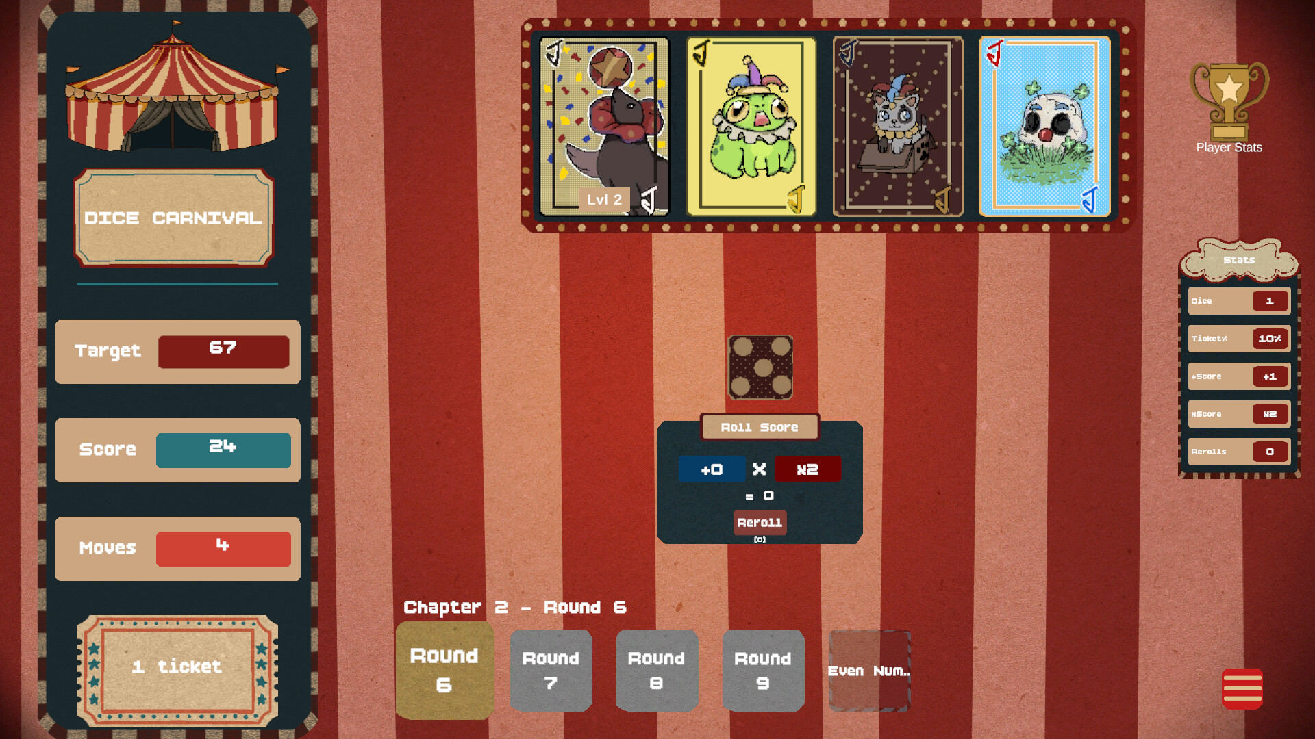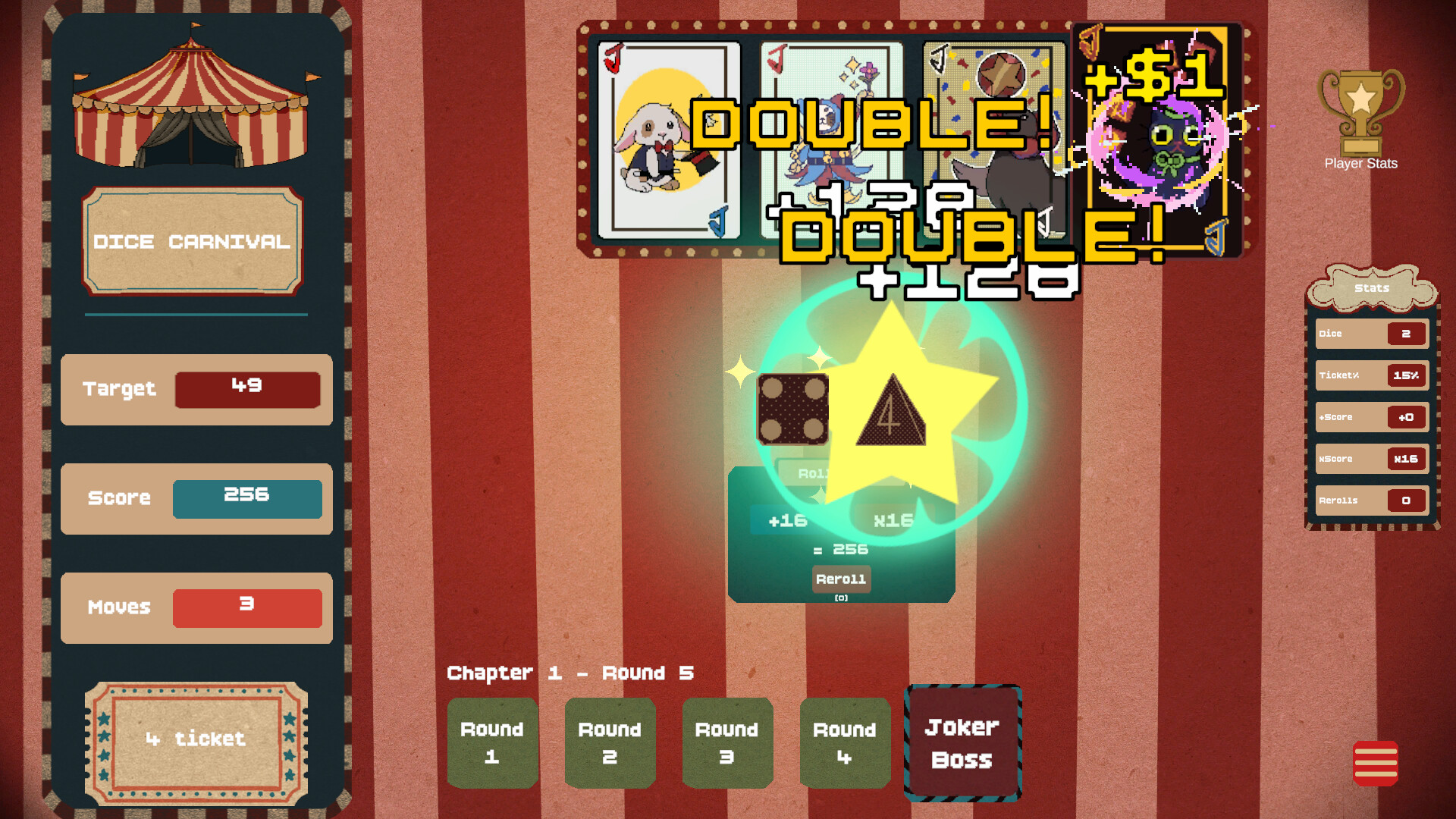 Dice Carnival is a roguelike deck-building game inspired by dice, focused on creating powerful synergies to achieve high scores. Discover unique Jokers, defeat Bosses, and trigger crazy combinations!