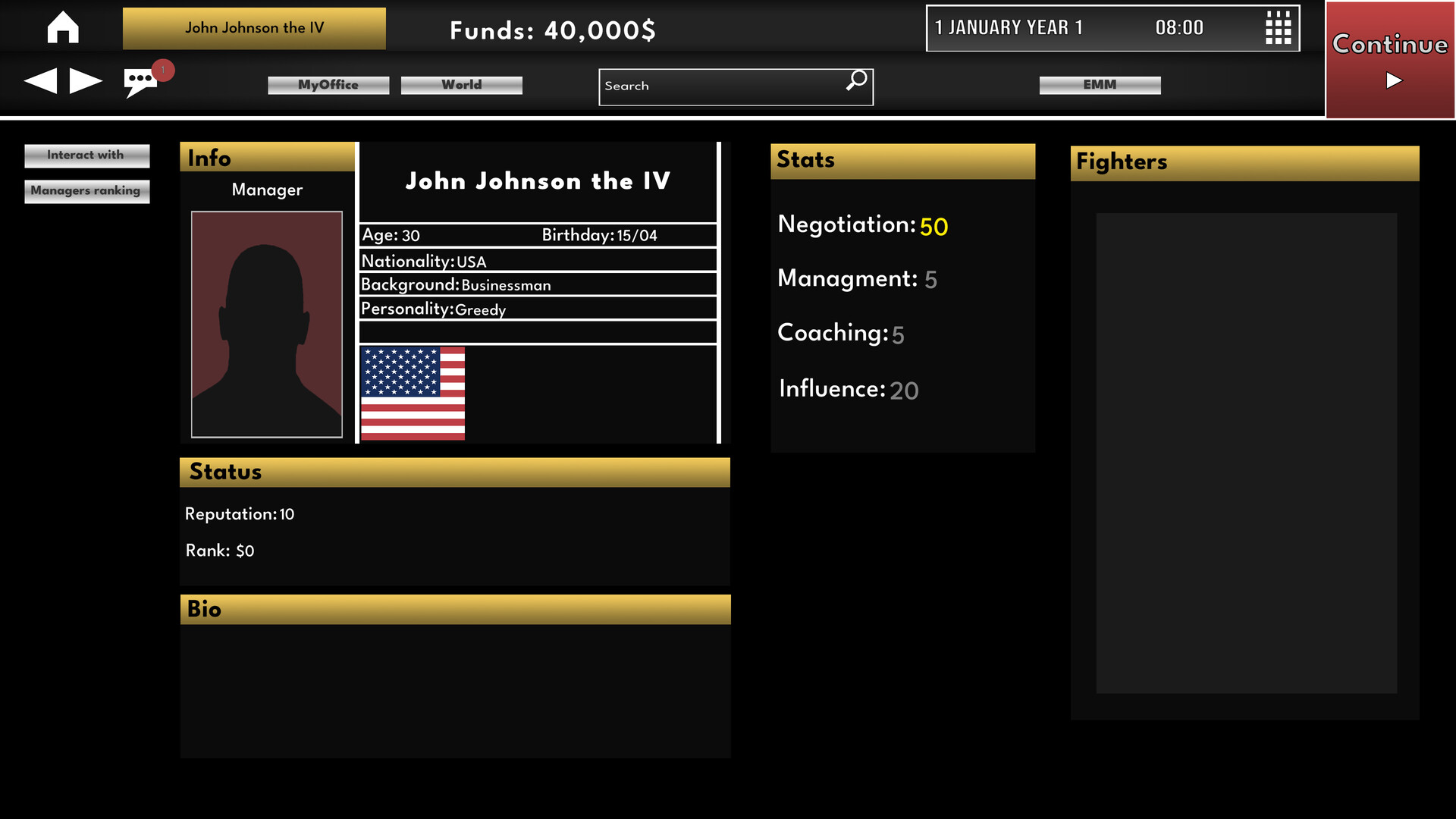 Recruit fighters, guide their progression, negotiate with promotions and shape their rise in a dynamic MMA world where every decision matters.