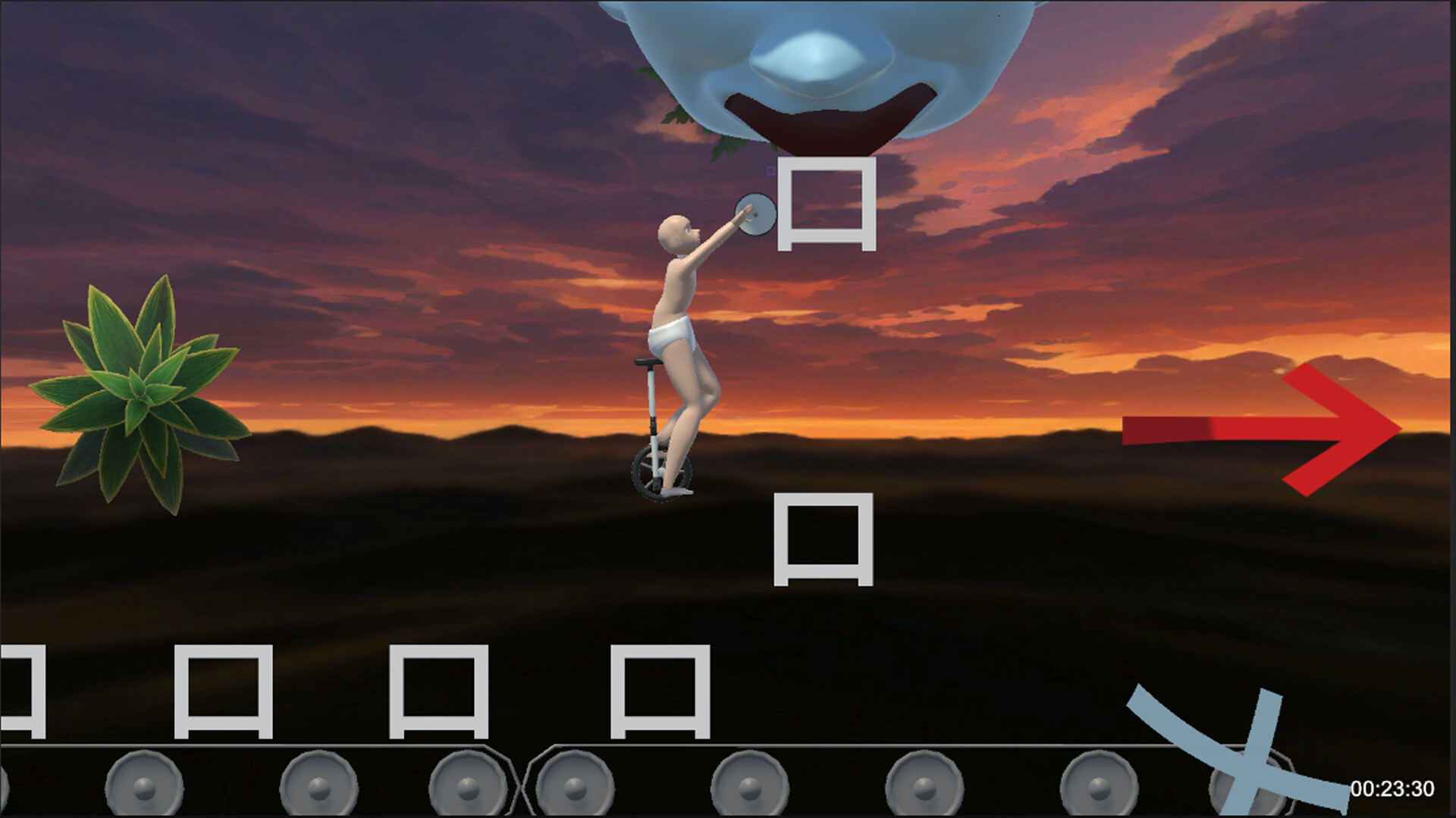 It's a game where an old guy with a roller for working out his abs while riding a unicycle just climbs katakana. Farts happen.