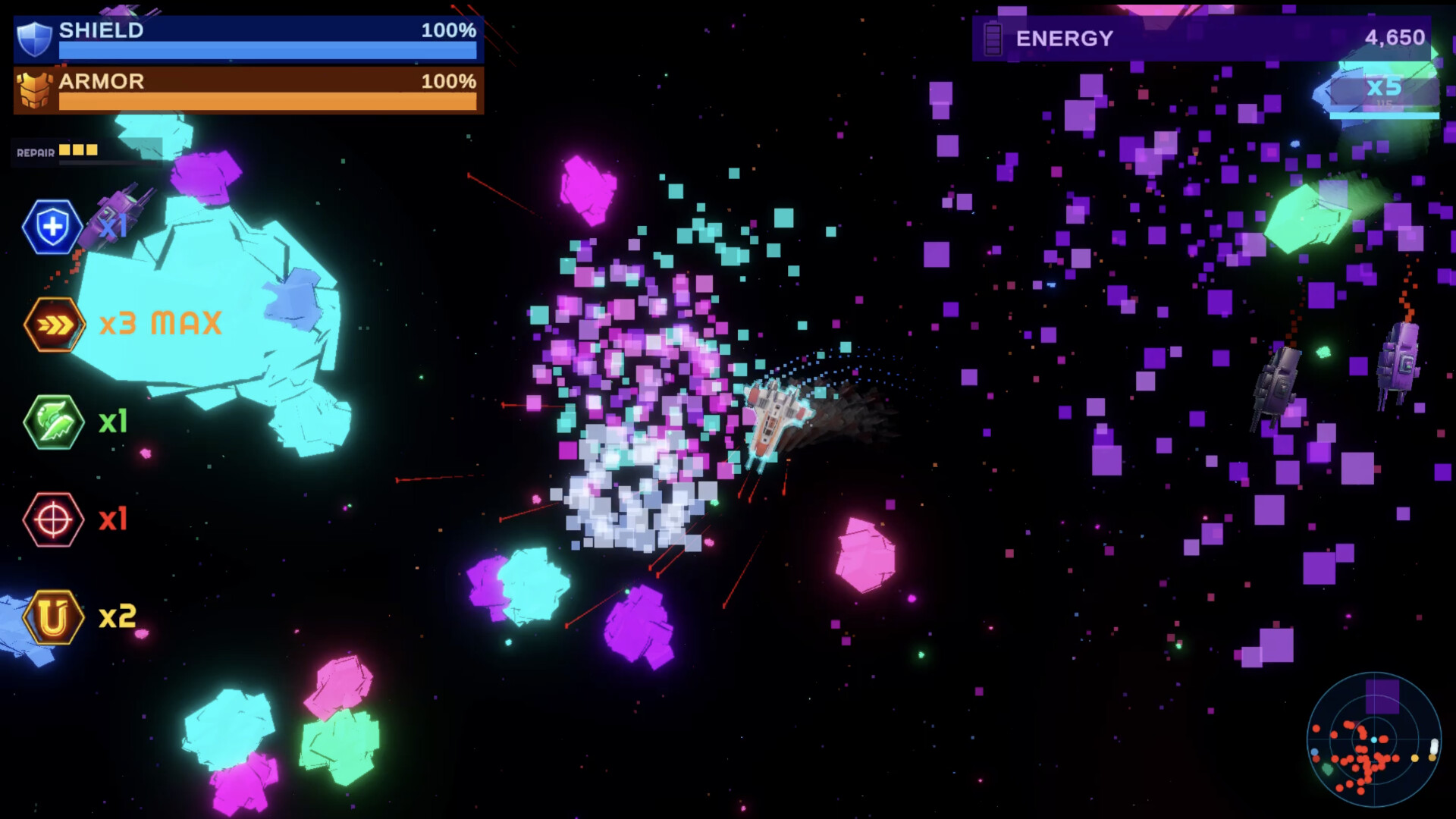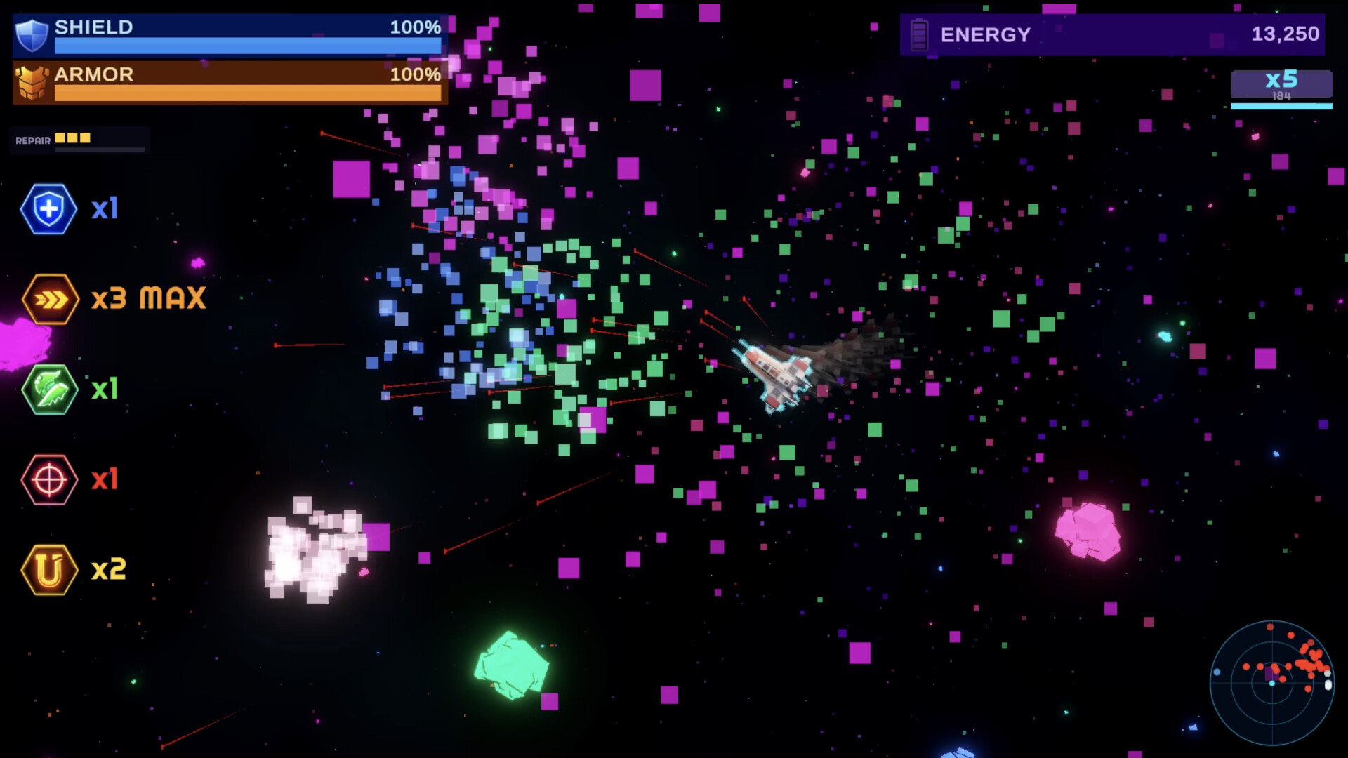 A top-down space shooter roguelite built on momentum. Chain kills into devastating combos as you fly dock-to-dock through escalating gauntlets. Between runs, your AI companion Luna helps you prepare — and she'll do anything to keep you safe.