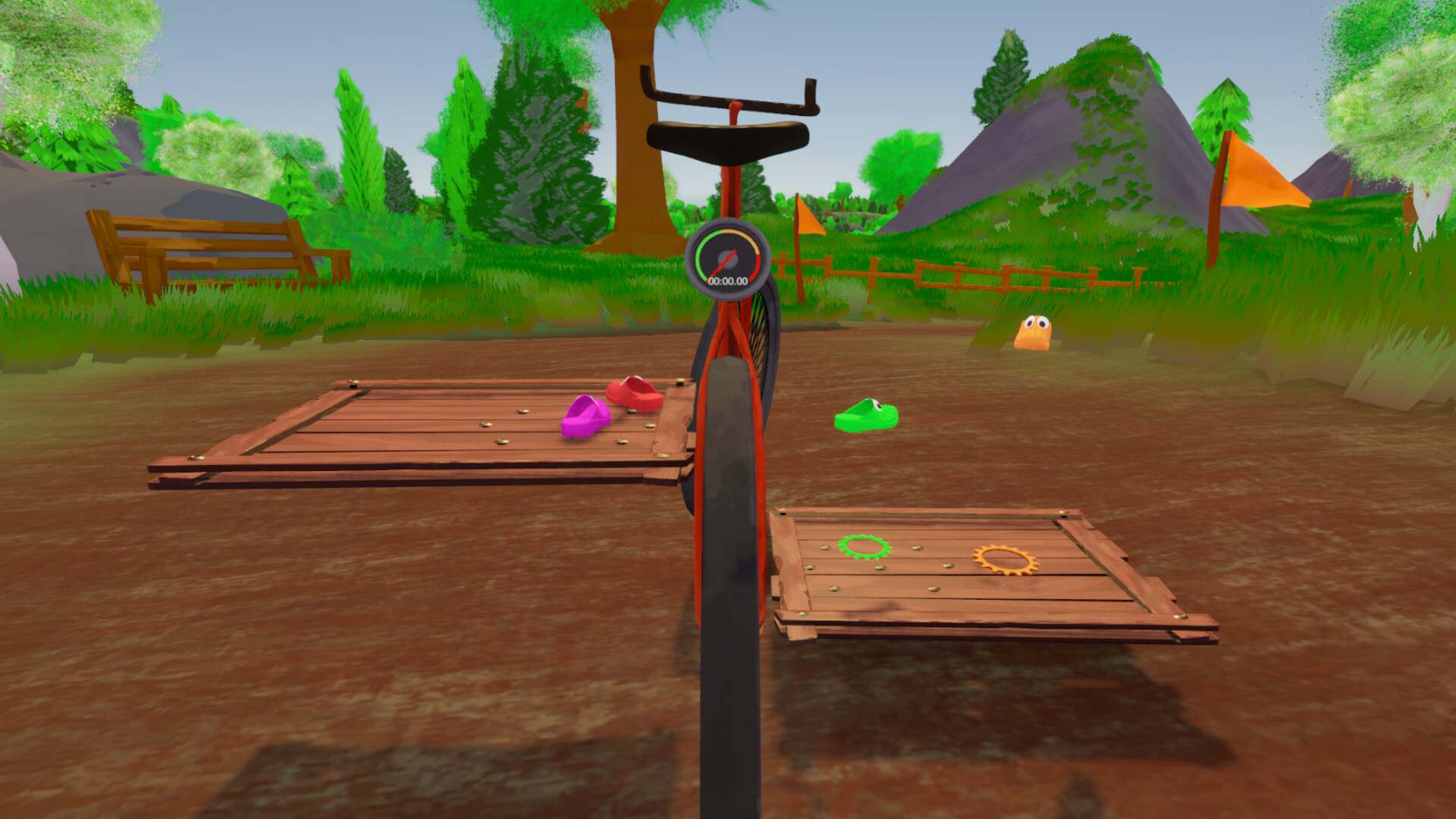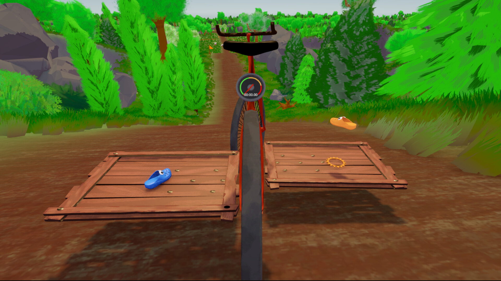 Fiets-Together is a chaotic co-op racing game in which 2-4 players control a bicycle together. Each player controls one shoe on a pedal, together you accelerate and steer the bike. The goal is to chase best times, unlock customizations, and keep your friendship.