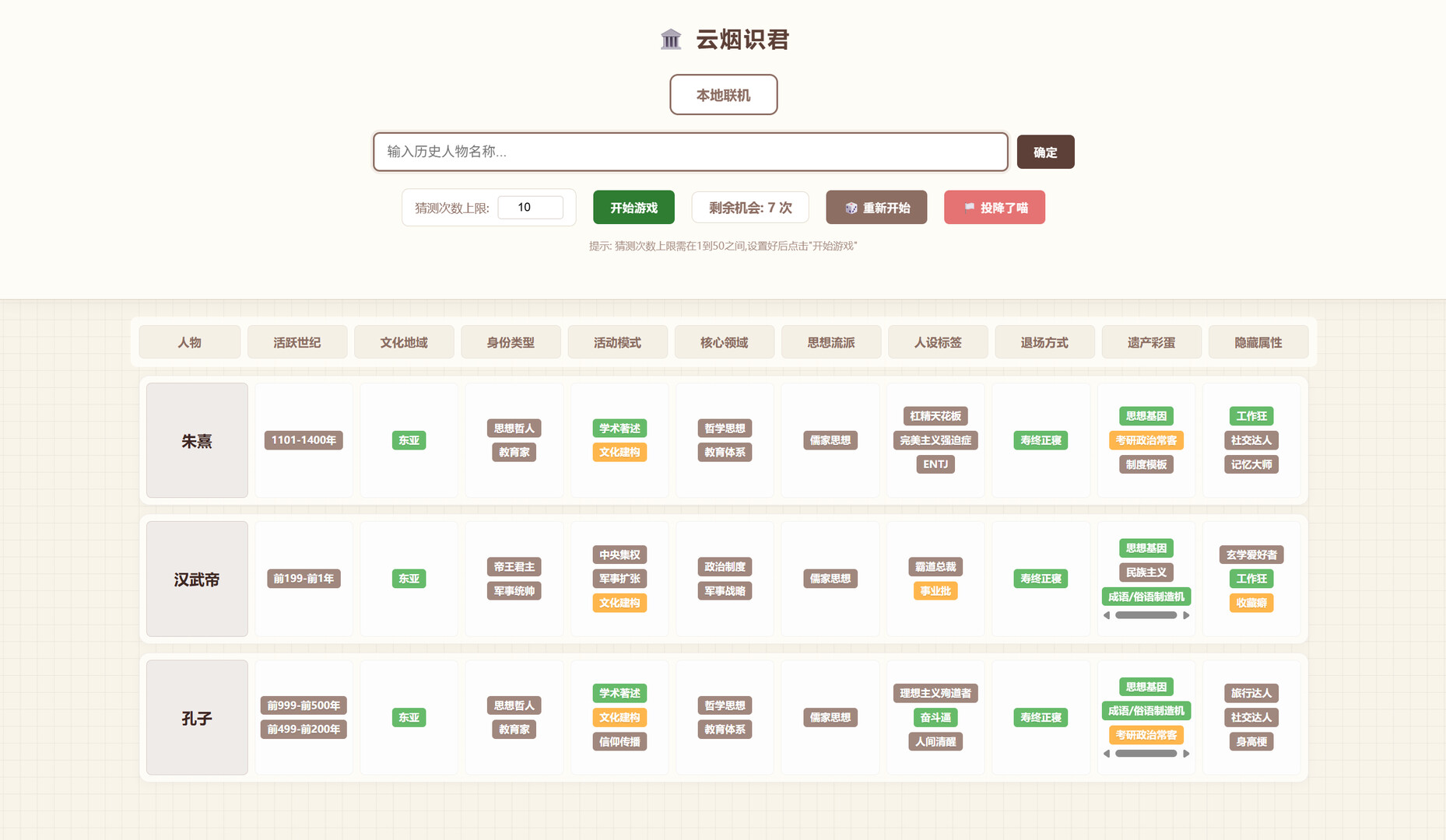 A deduction game about historical figures. Enter characters to compare attributes and follow color‑coded hints to narrow down the answer. Analyze, associate, and identify the target, or enjoy co‑op, speed, and versus modes for competitive deduction fun.
