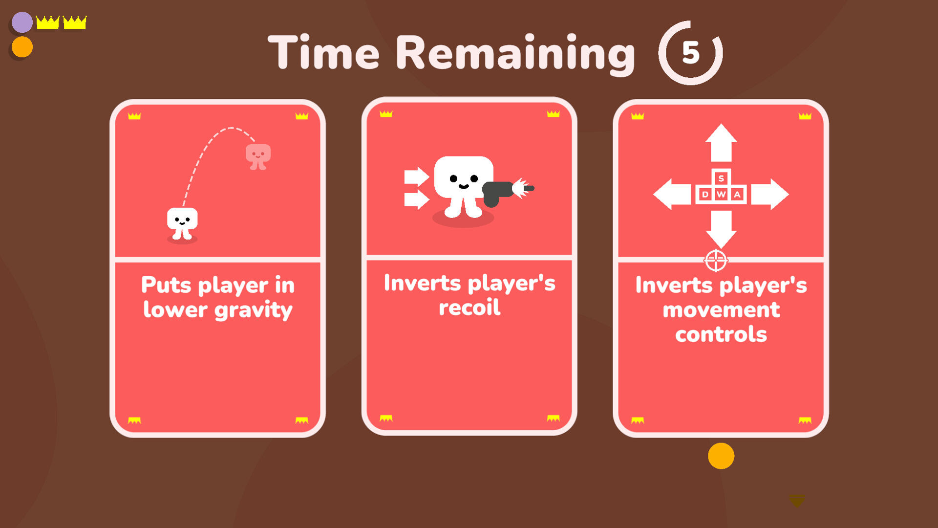 A casual 2-4 player couch/online rogue-lite round based fighting game. The losing players of each round vote on a unique debuff for the winner of the round to even the odds.