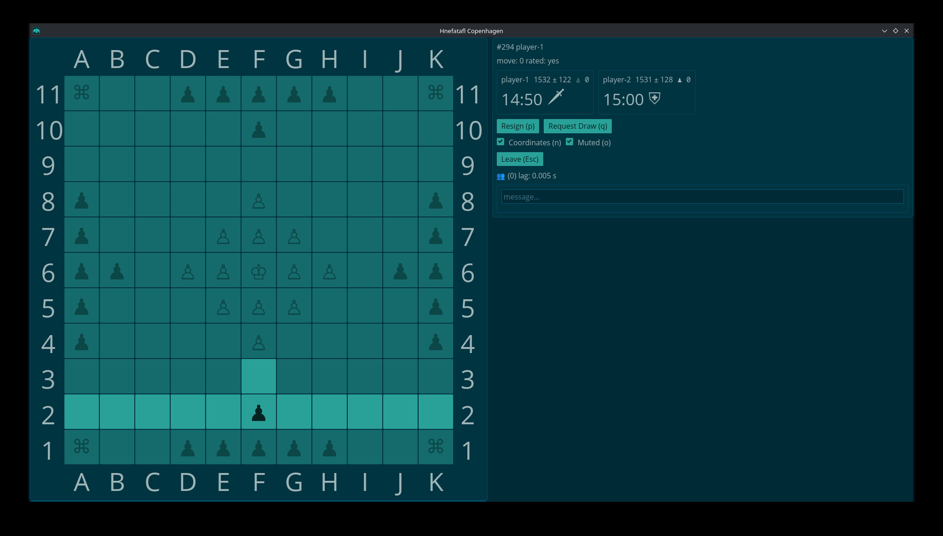 The game of Copenhagen Hnefatafl is a turn based strategy game with roots going back hundreds of years. It is a bit like chess and played on 11 by 11 and 13 by 13 size board. The client supports playing games, playing in tournaments, reviewing games and going through different move choices.