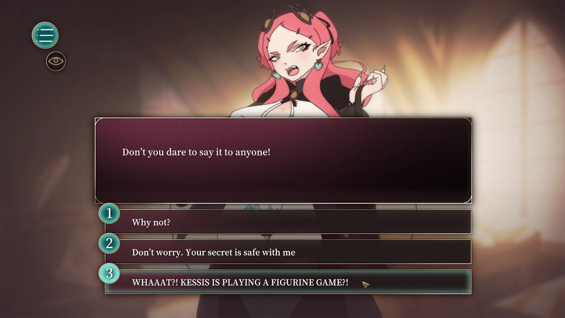 An adult visual novel where you have intimate relations with Kessis every time you beat her in her most favorite geeky game.