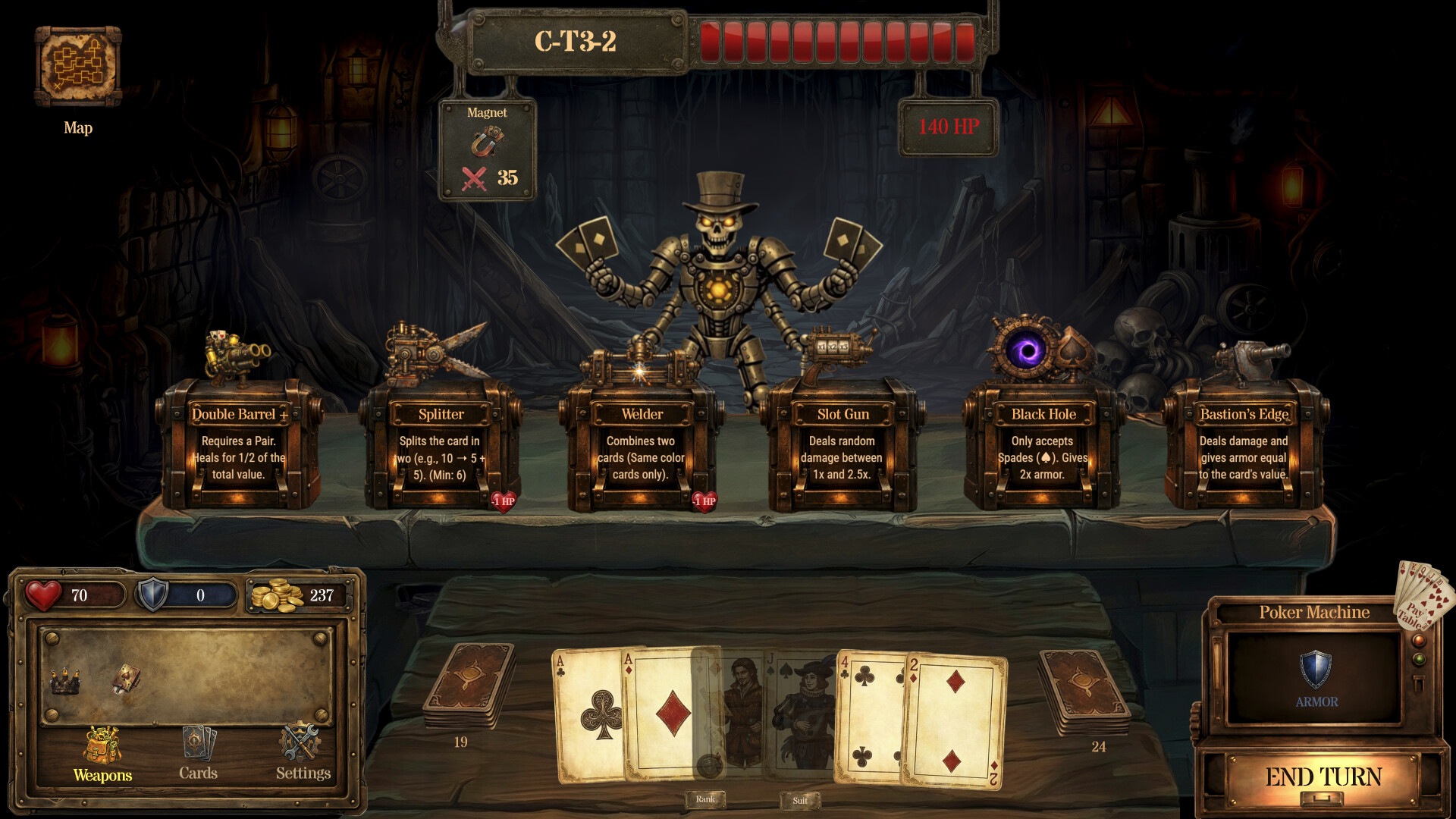 King’s Bet is a roguelite deckbuilder where you drag poker cards onto rusty machines to trigger attacks and powerful combos. Build synergies, upgrade weapons, and fight your way out of the well. Strategy matters more than luck.