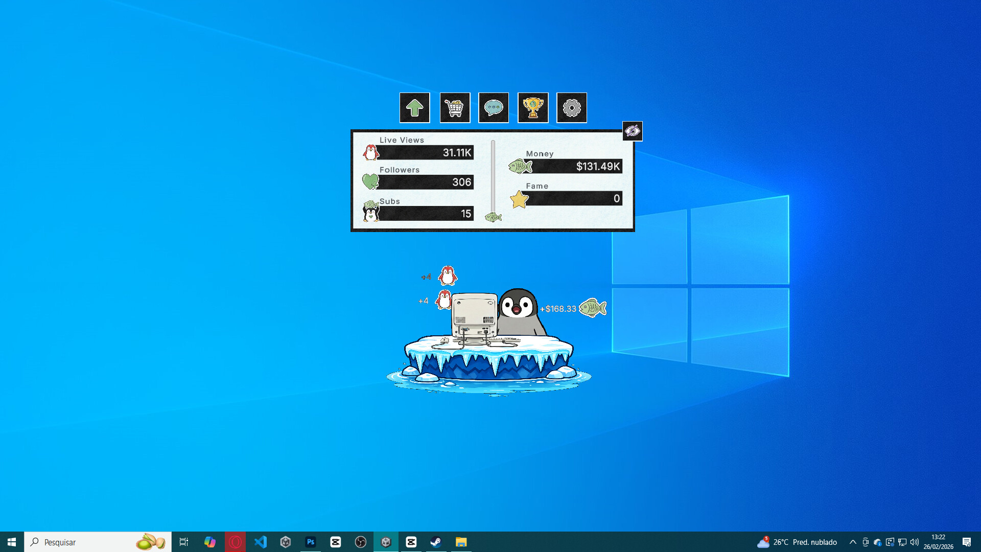 Kinguin is a relaxing idle simulator about a penguin streamer. Leave the game in the corner of your screen while you work, upgrade your setup to turn views into valuable followers and subs, and climb the Global Rank. Dominate the algorithm and become the internet's greatest polar legend!