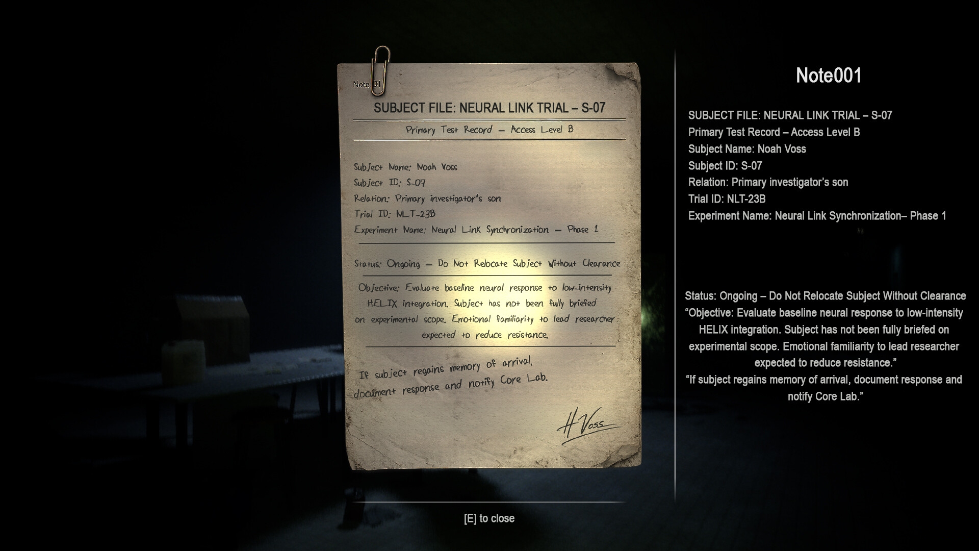 A psychological narrative horror game where you explore an abandoned government lab while an AI using your father’s voice guides you..