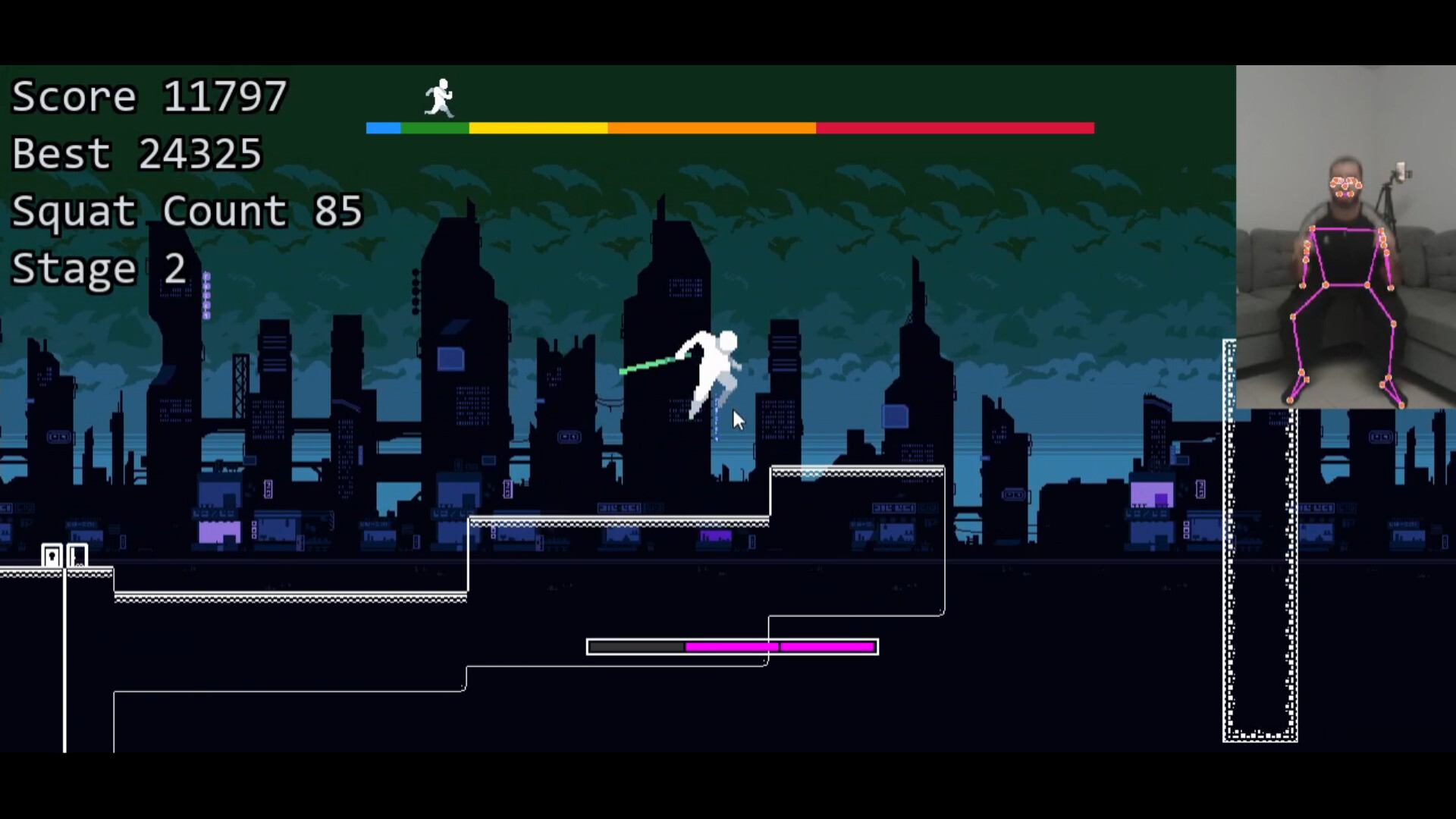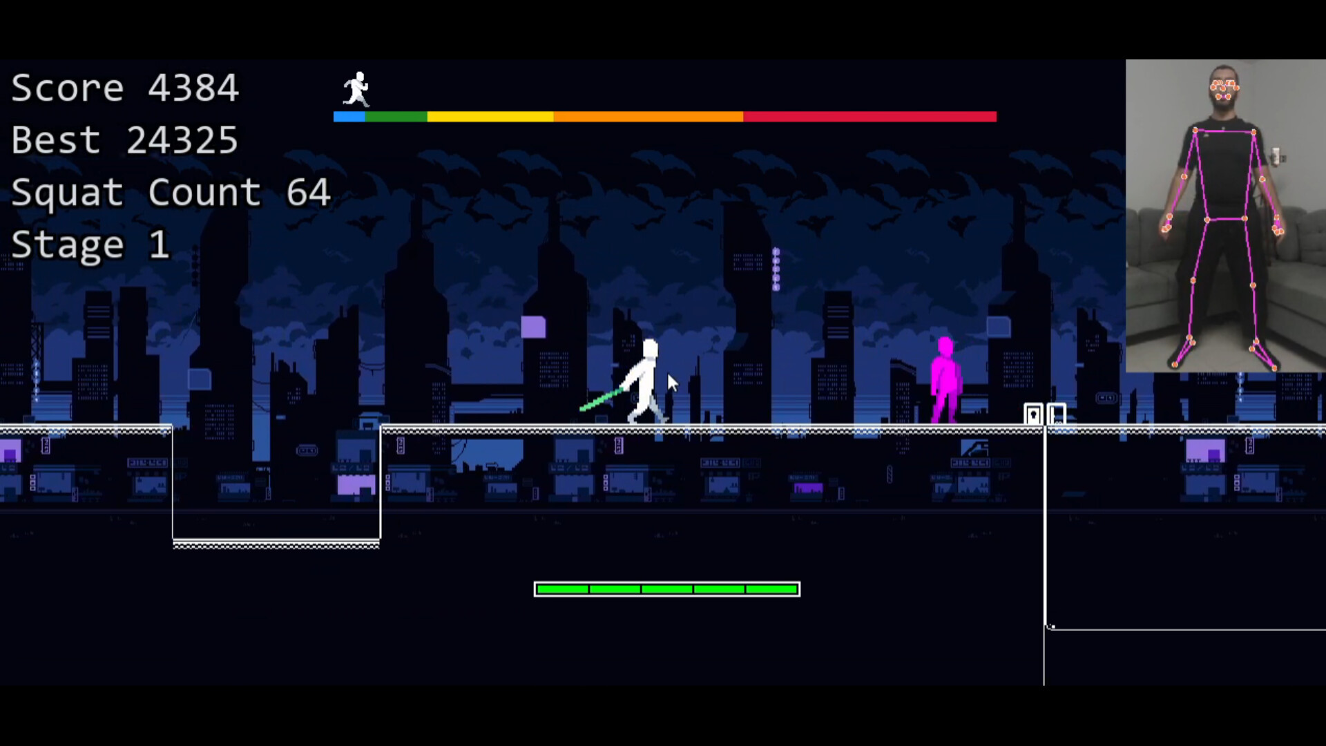 This is a runner game but to jump you do a real life squat! The game uses the camera to detect squats. Squat a certain amount of times and get a sword powerup.