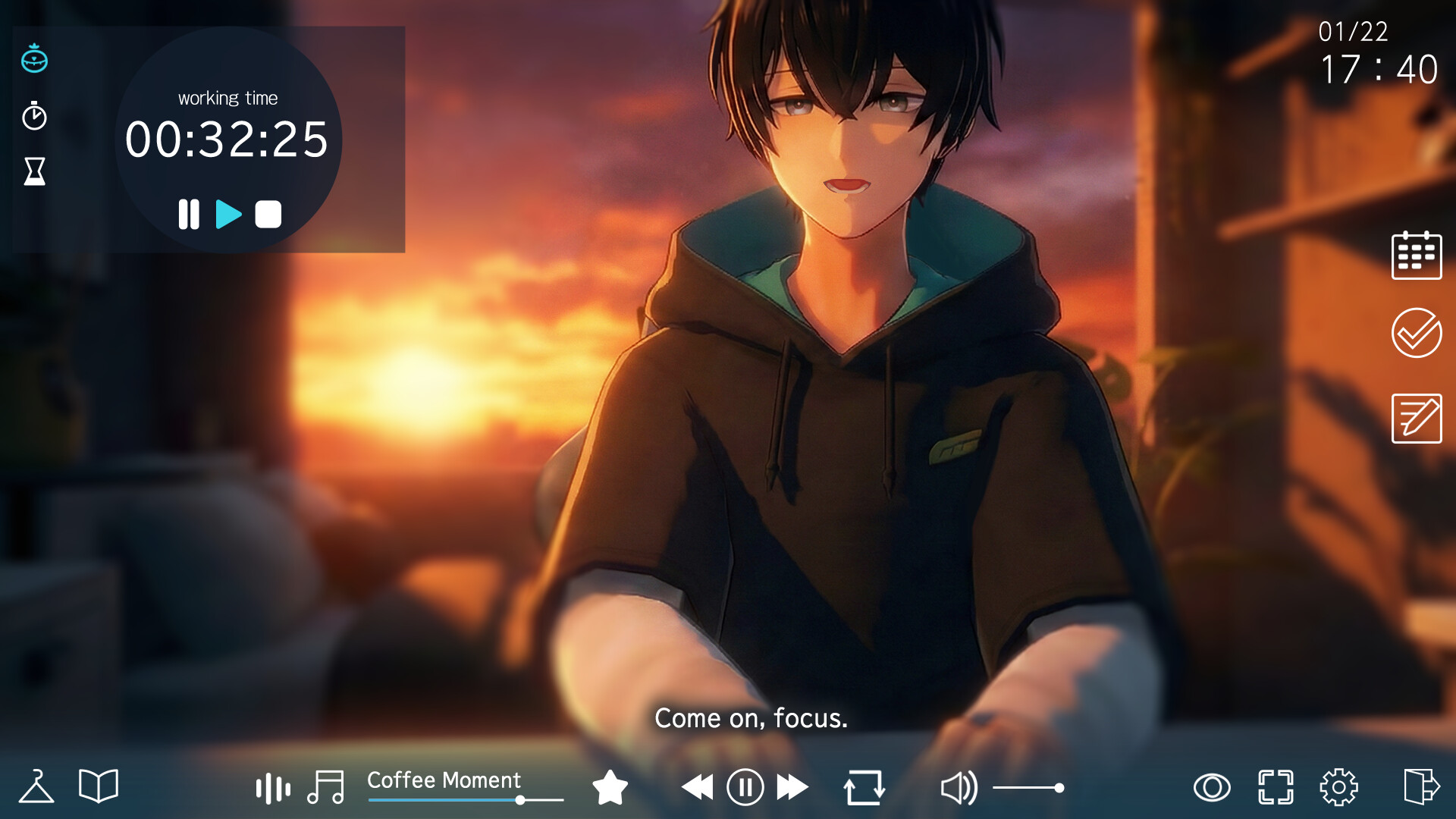 Mellow Echoes: Lo-Fi Moments is a productivity support game for focused work. Using tools like a Pomodoro timer, you quietly share time with a young man while progressing through tasks. A rich BGM playlist provides a calm, reassuring atmosphere.