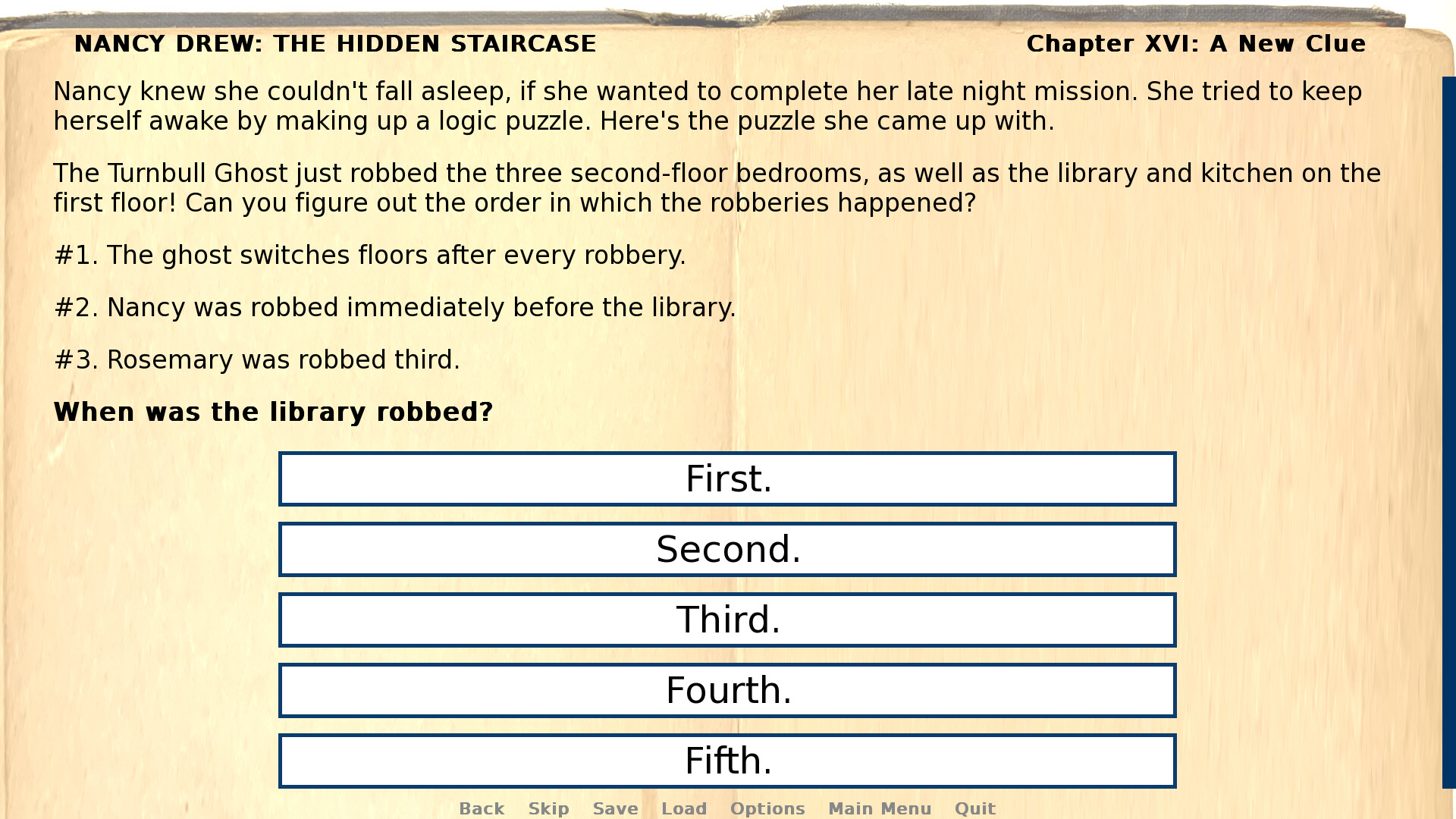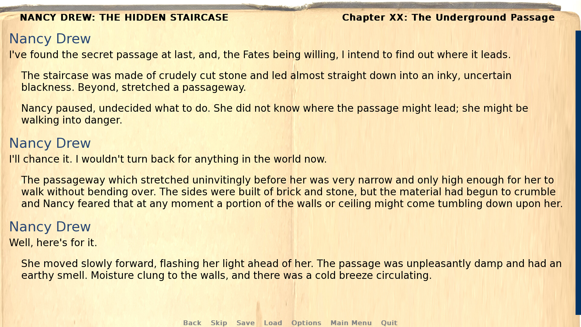 "Nancy Drew: The Hidden Staircase" is a text-based mystery adventure set in the year 1930, where Nancy Drew investigates a haunted house and solves a kidnapping mystery. Make choices, solve puzzles, and guide Nancy through the case!