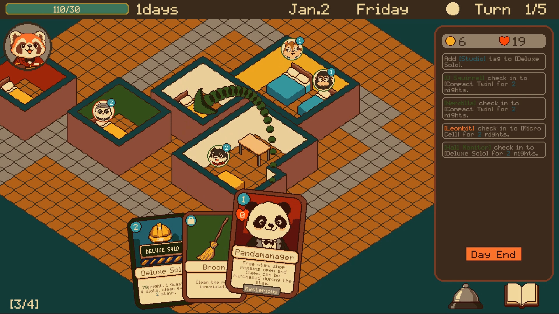 Manage a chaotic hotel in this Roguelite deckbuilder! Meet your slacking Panda manager, arrange rooms for animal guests, and hit demanding KPIs in tight spaces. This hotel needs talent like you!