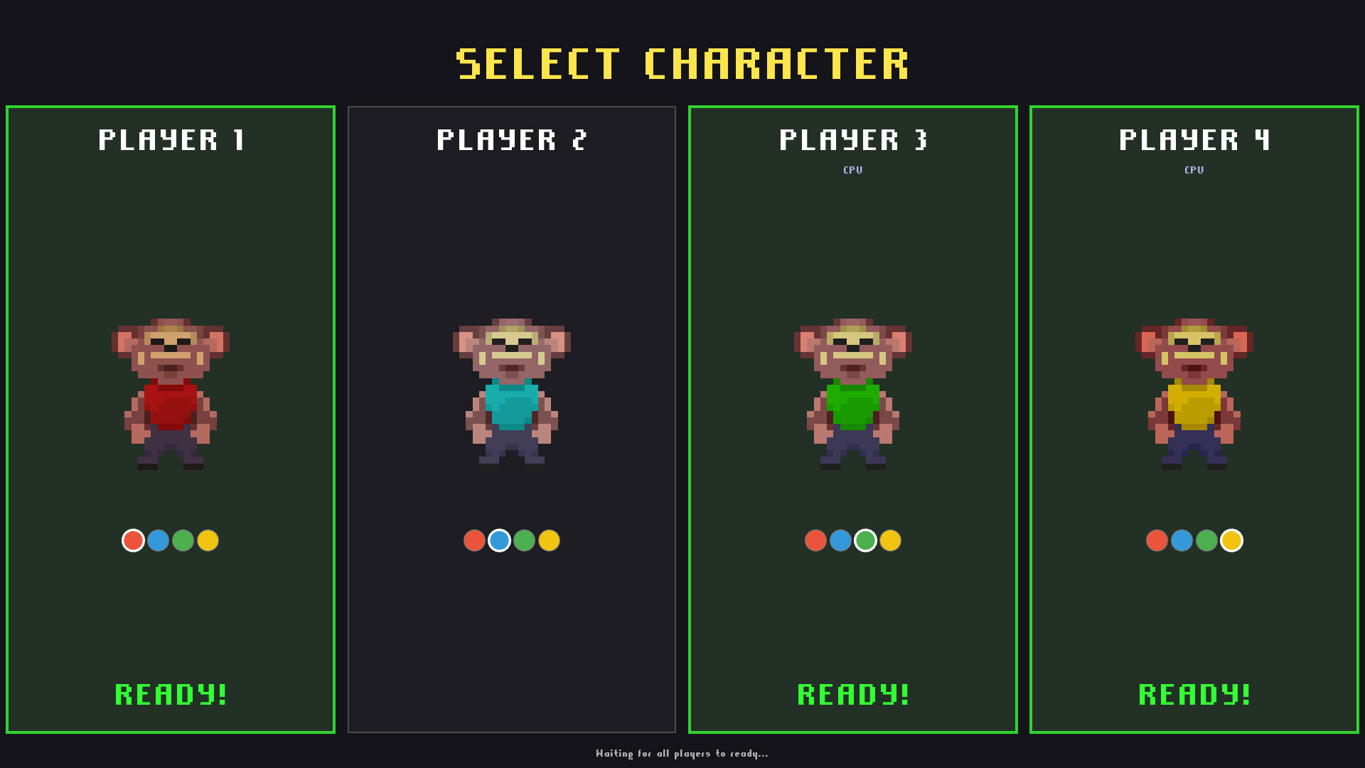 Panic of the Apes is a chaotic 1 to 4 player couch PvP game where apes battle to stockpile before a volcano erupts. Grab bananas, pelt rivals to steal theirs, eat for speed boosts, loot chests, and dodge roll to deflect shots. Most bananas at zero wins. First ape to three rounds is King Chimp!
