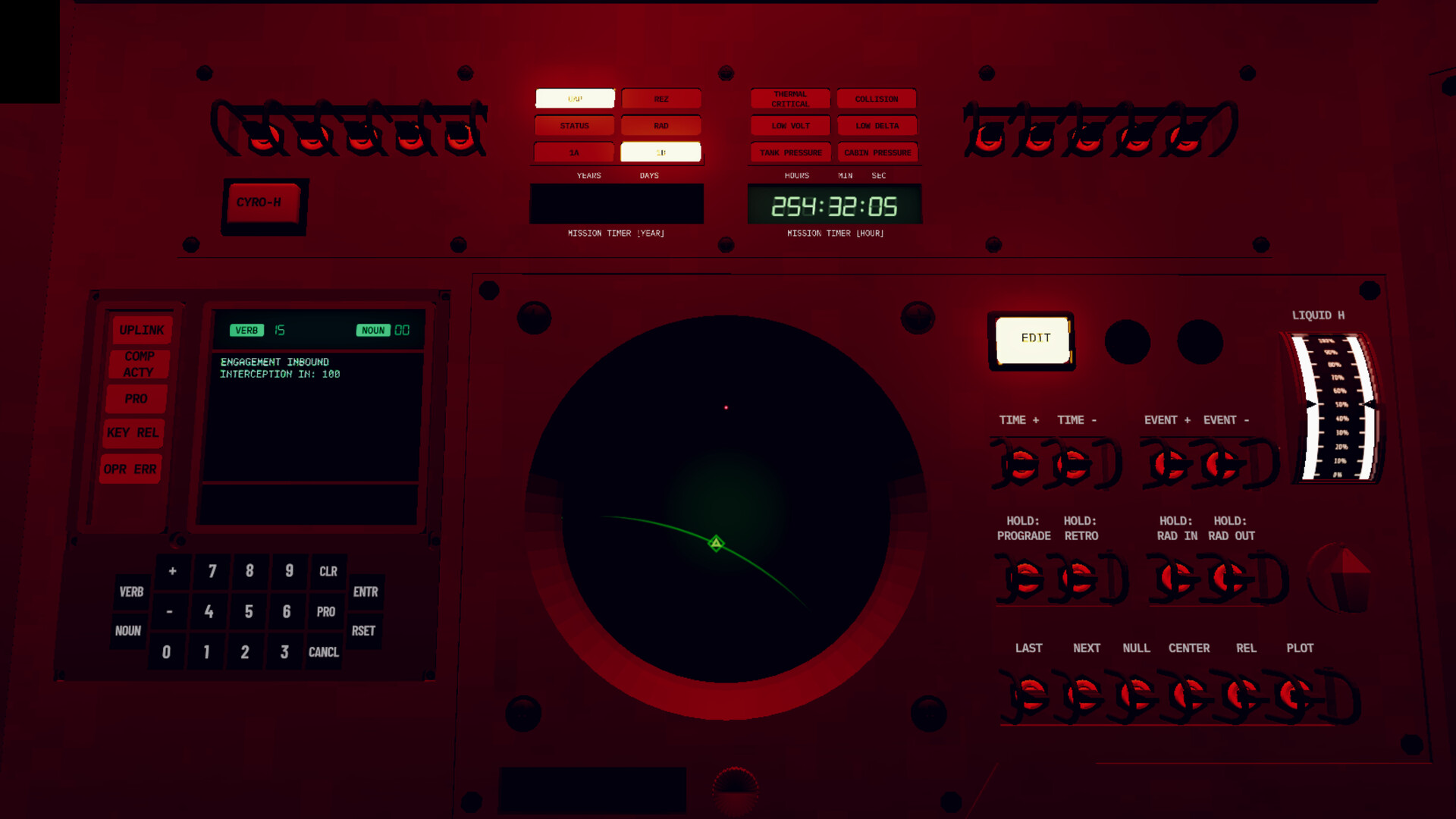 Navigate star systems using real orbital mechanics. Pilot a cockpit with controls inspired by the Apollo command module. Manage heat, energy, and trajectory.