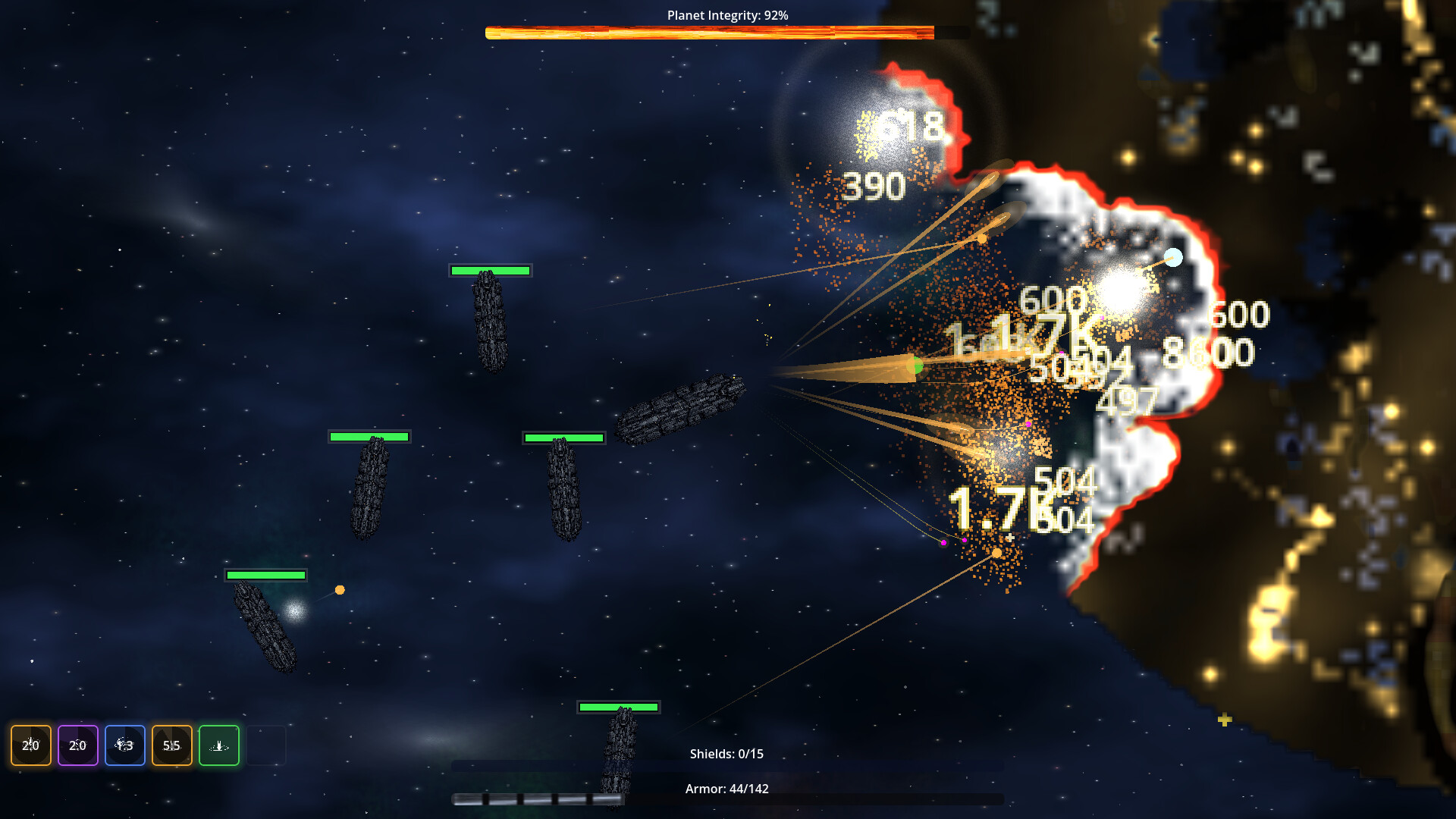 A physics-driven sci-fi destruction roguelite. Orbit hostile worlds, unleash devastating weapons, and carve real craters into fully simulated planets while escalating planetary defenses fight back.