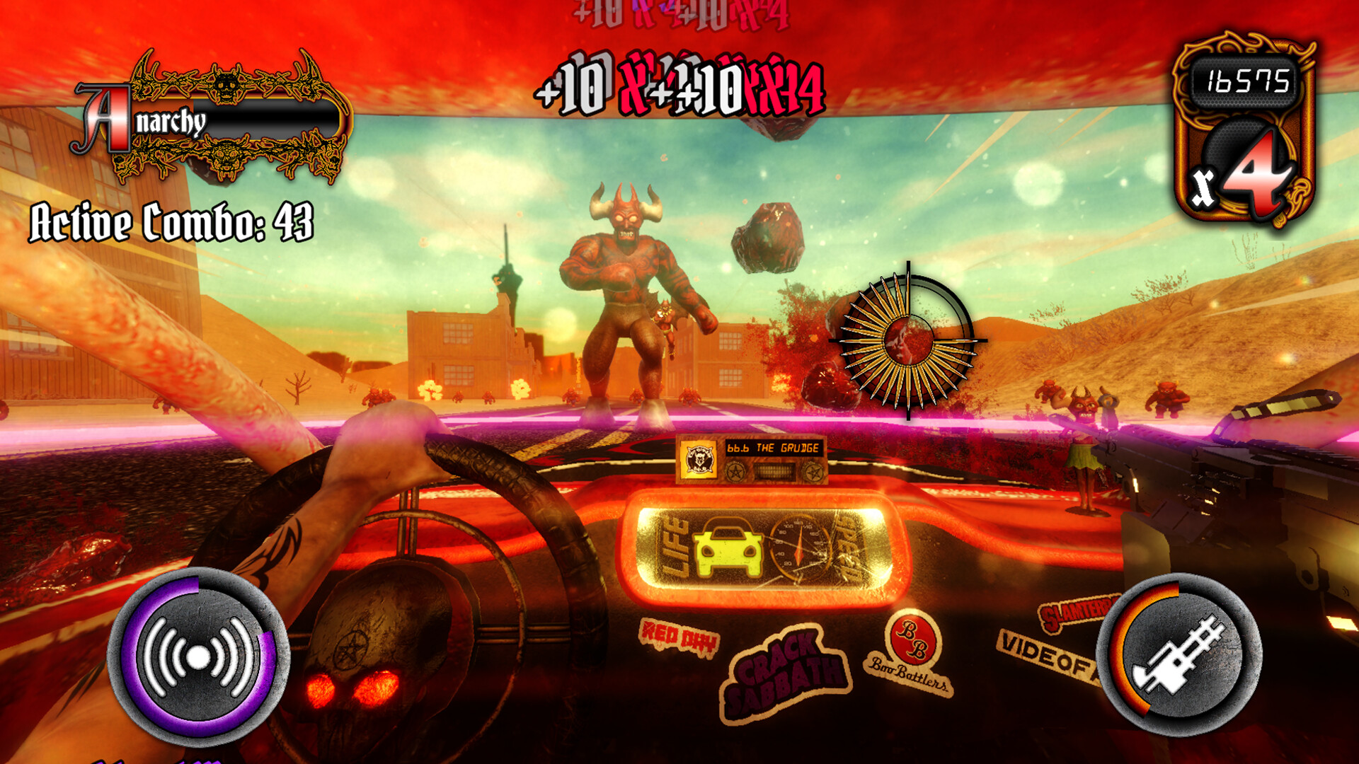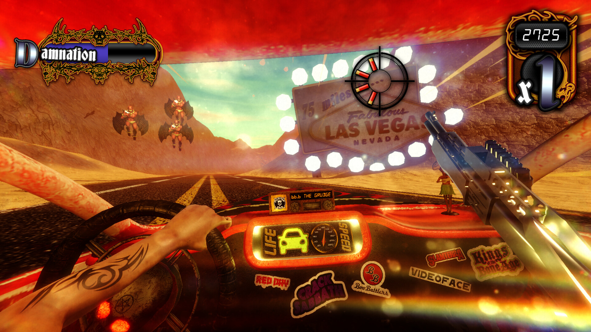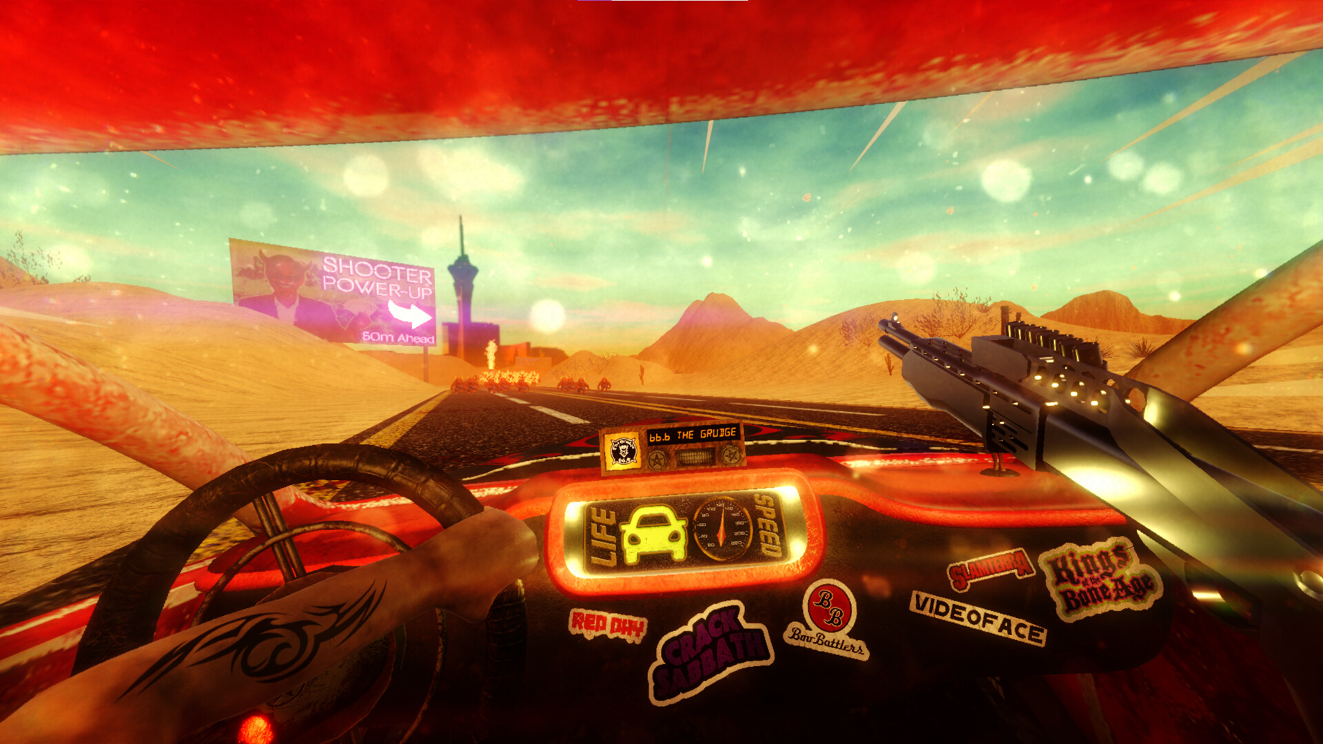 Riding Shotgun is an arcade car combat game. Players commandeer the Crimson Crucible -- driving and shooting across the Mojave mowing down hordes of relentless demons. Keep your wits about you to reach your destination; the City of Sin - Las Vegas.