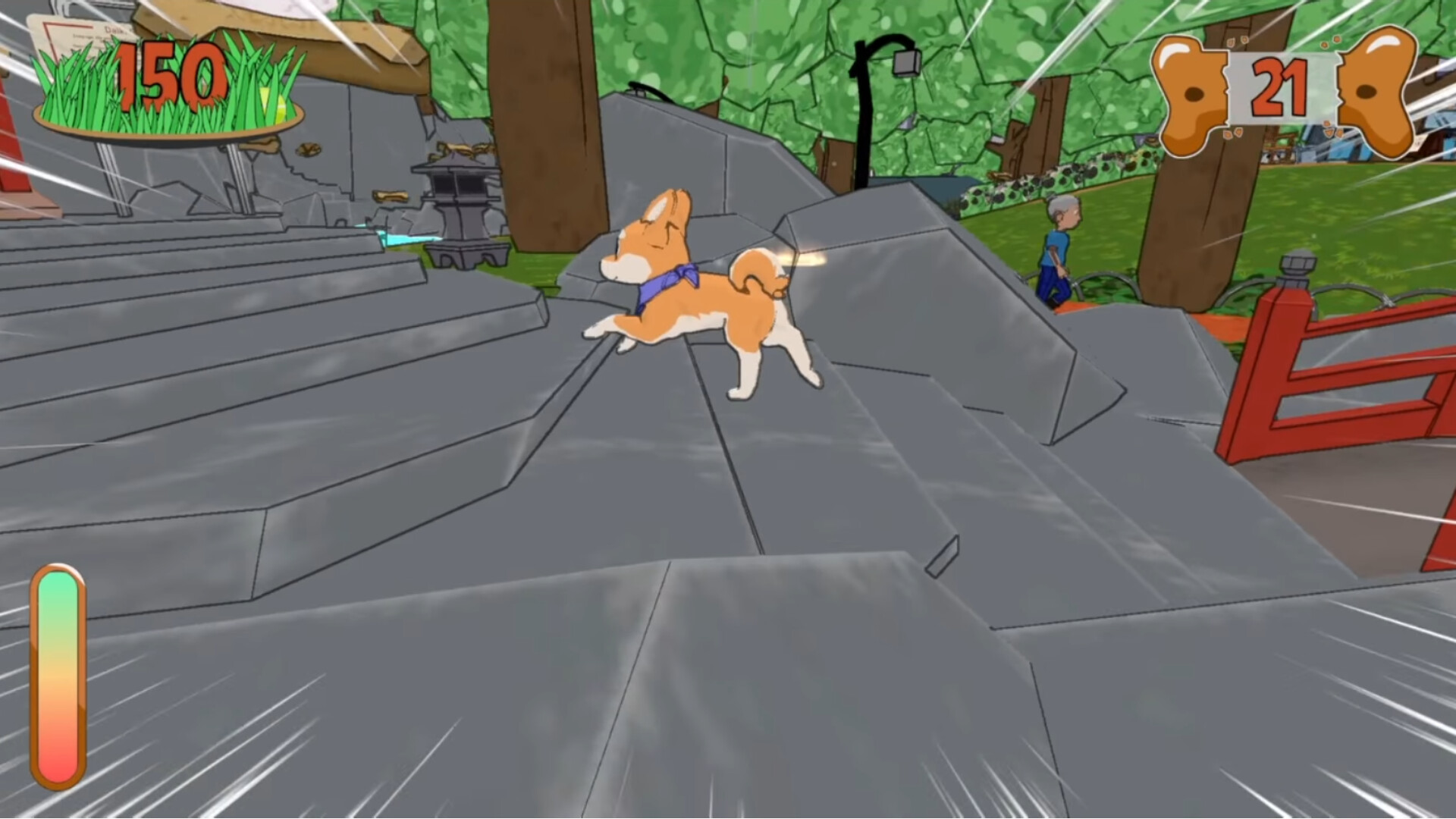 Goma the dog has escaped from their owner’s leash and is running around the park without restraint to eat as many biscuits as they can. Help them fill their stomach before time runs out or choose to explore the park on your terms.