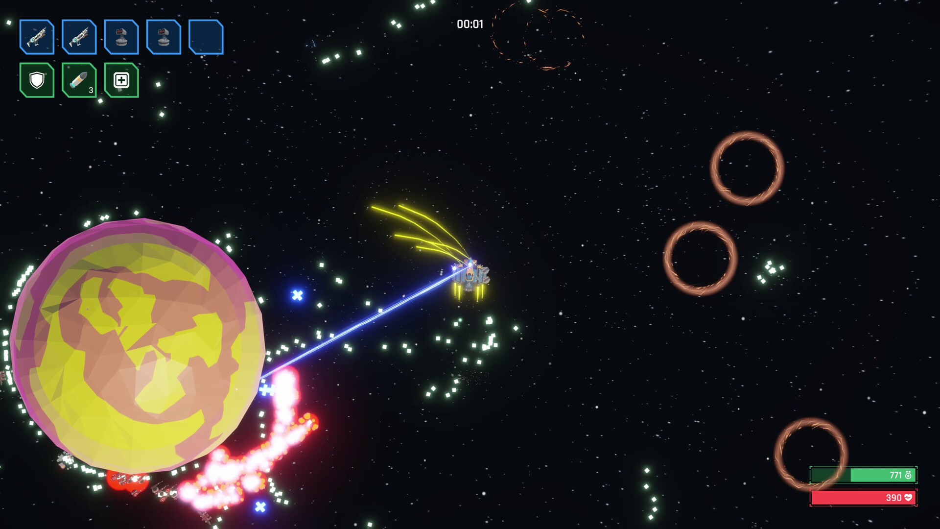A fast paced bullet heaven, control your Sci-fi spaceships with semi-newtonian physics. Last 7 minutes against the drone armada until their boss arrives and fight your way to freedom! Use planetary gravity and other hazards to dodge superior numbers. Collect and combine weapons for maximum firepower