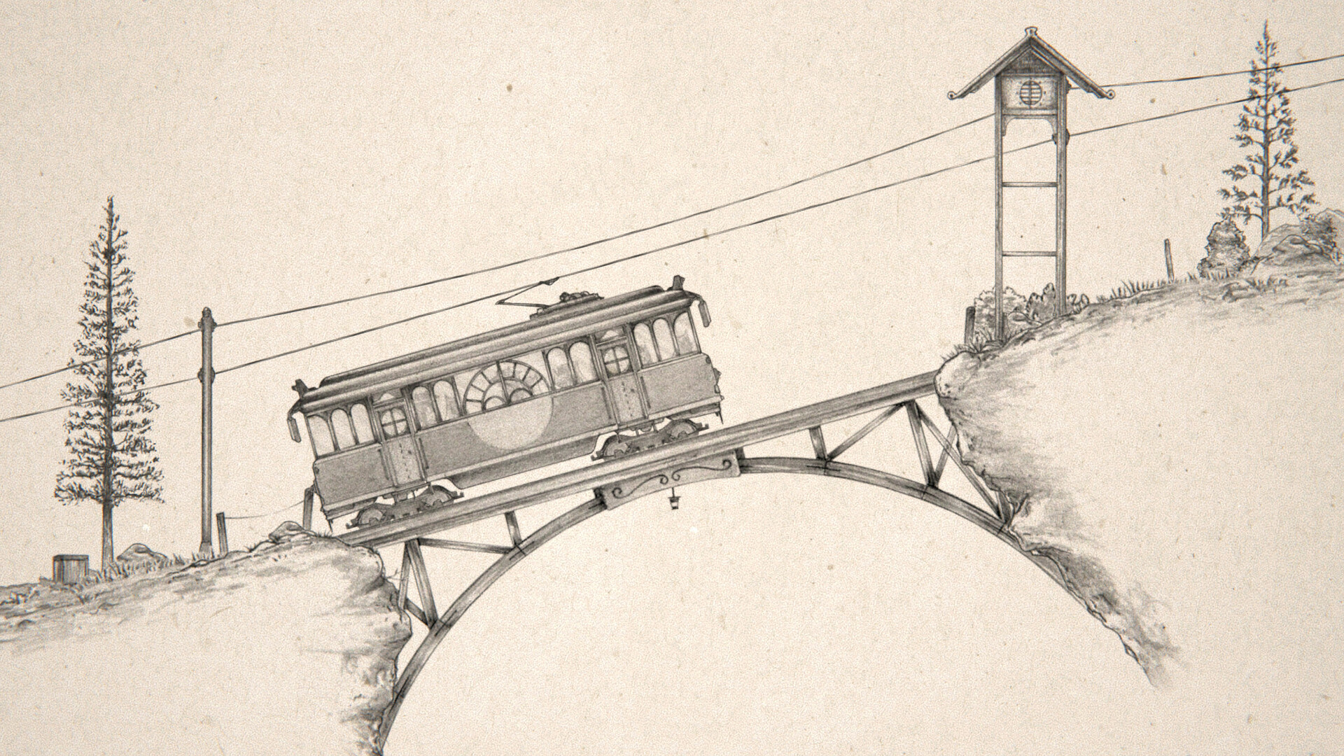 A hand-drawn, interactive illustration about a scenic tramway, windswept mountains and cats with places to be.