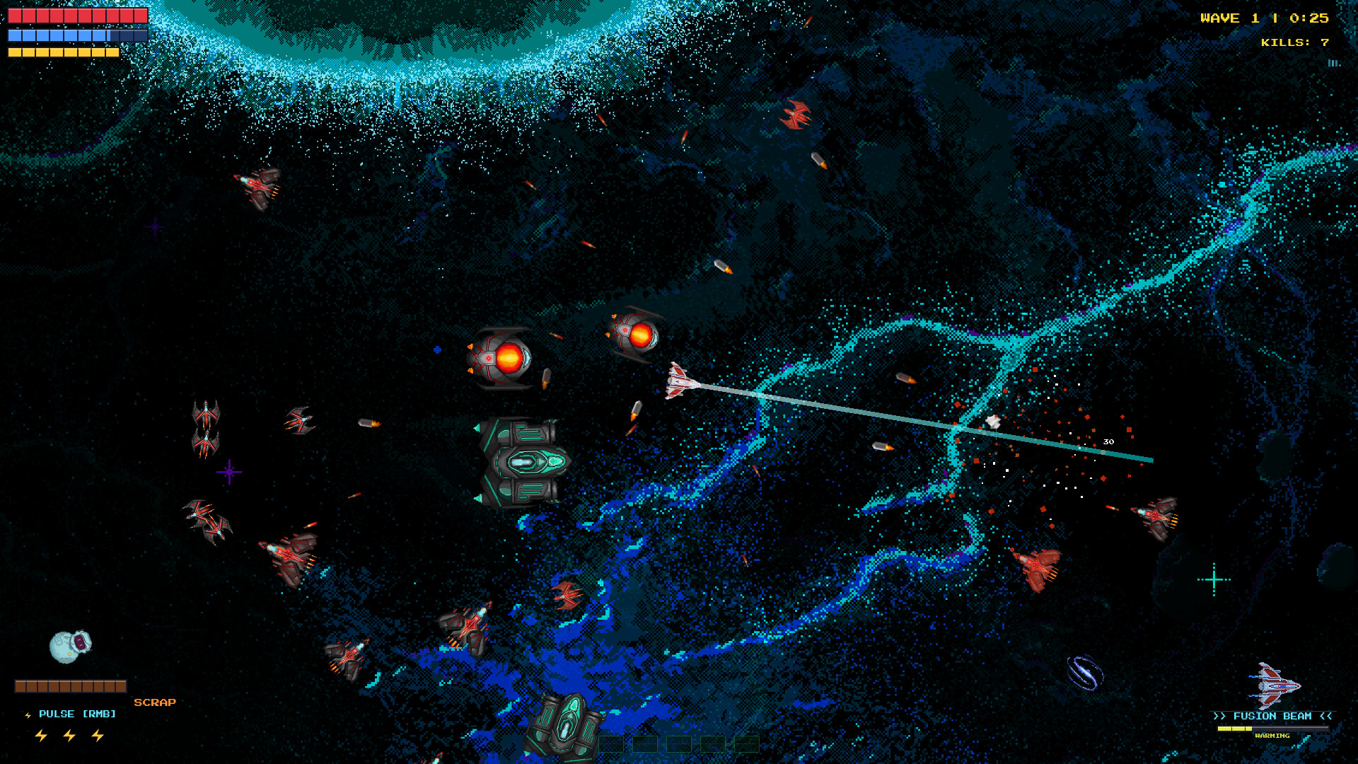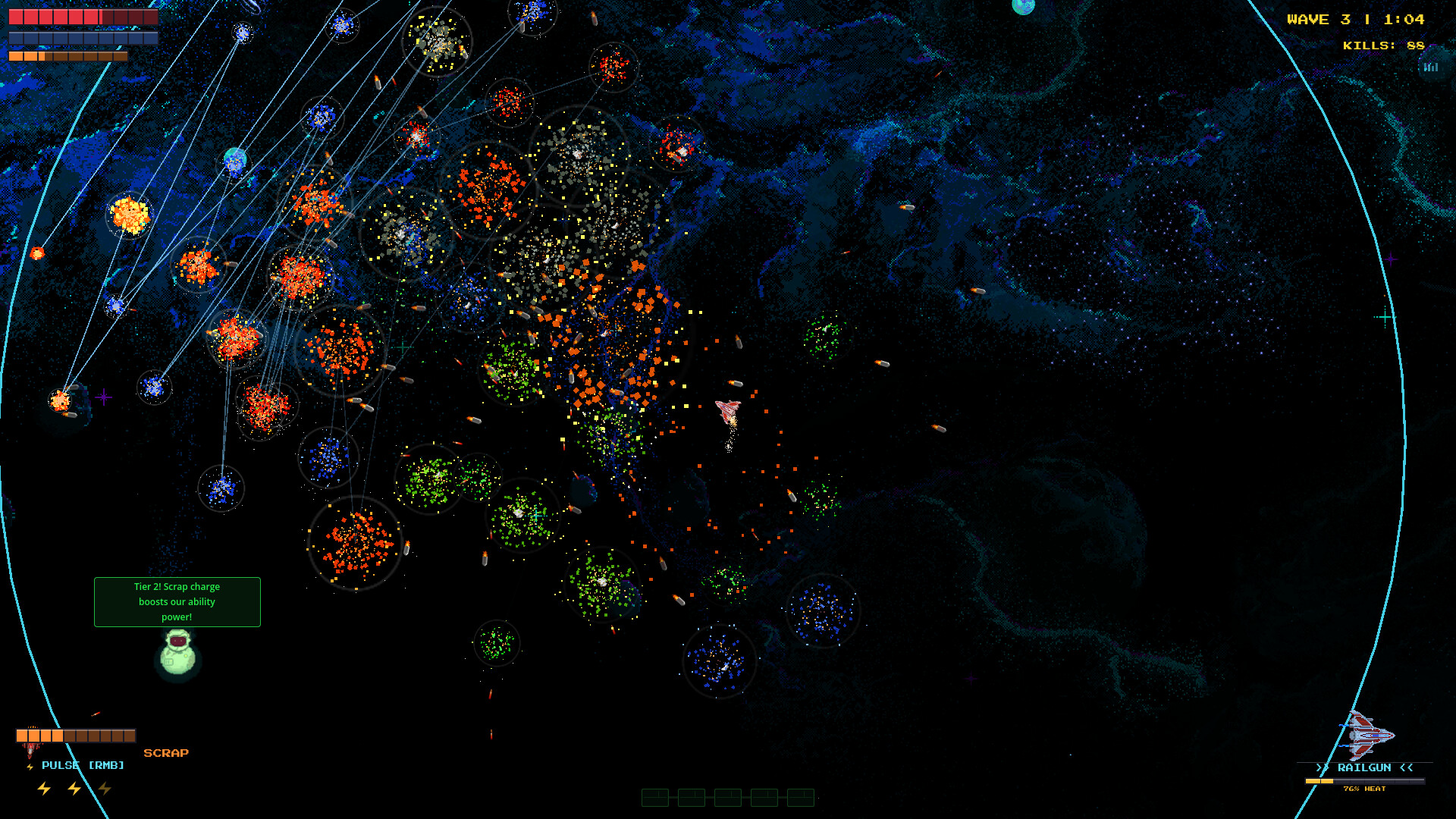 Star Scrap is a twin stick space roguelite where Star, a broke bounty hunter, blasts through 100 waves of aliens with 8 weapons, 33 upgrades, and a sarcastic salvage drone named Scrap.