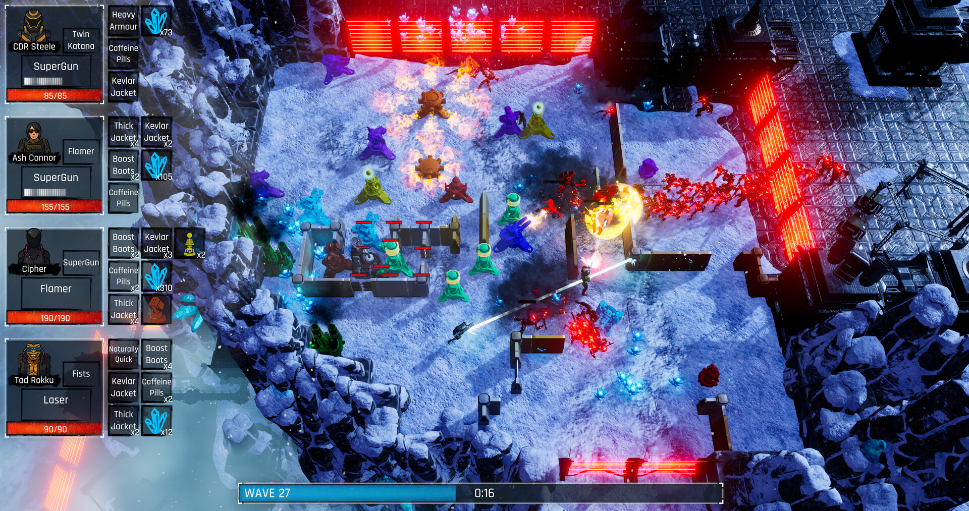 Stratum Defence Team is a local co-op base defense game for up to 4 players, set on hostile worlds. Defend your mineral extraction outpost. Build walls and turrets, fight on the front lines, and adapt through evolving upgrades to withstand intensifying assaults.