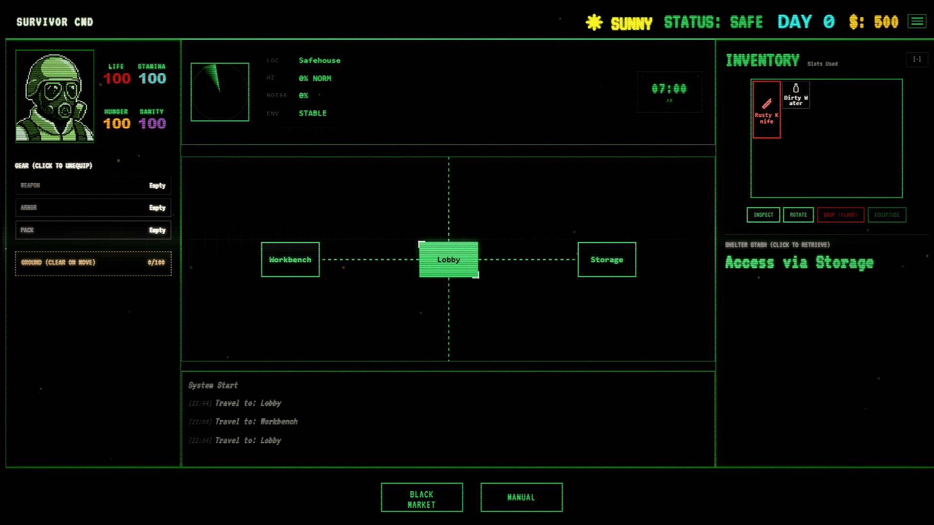 A single player text based survival strategy game. System initialized. Danger skyrocketing. Escape. Get weapons. Kill monsters. Make choices. Loot, loot, loot. Death. Try again.