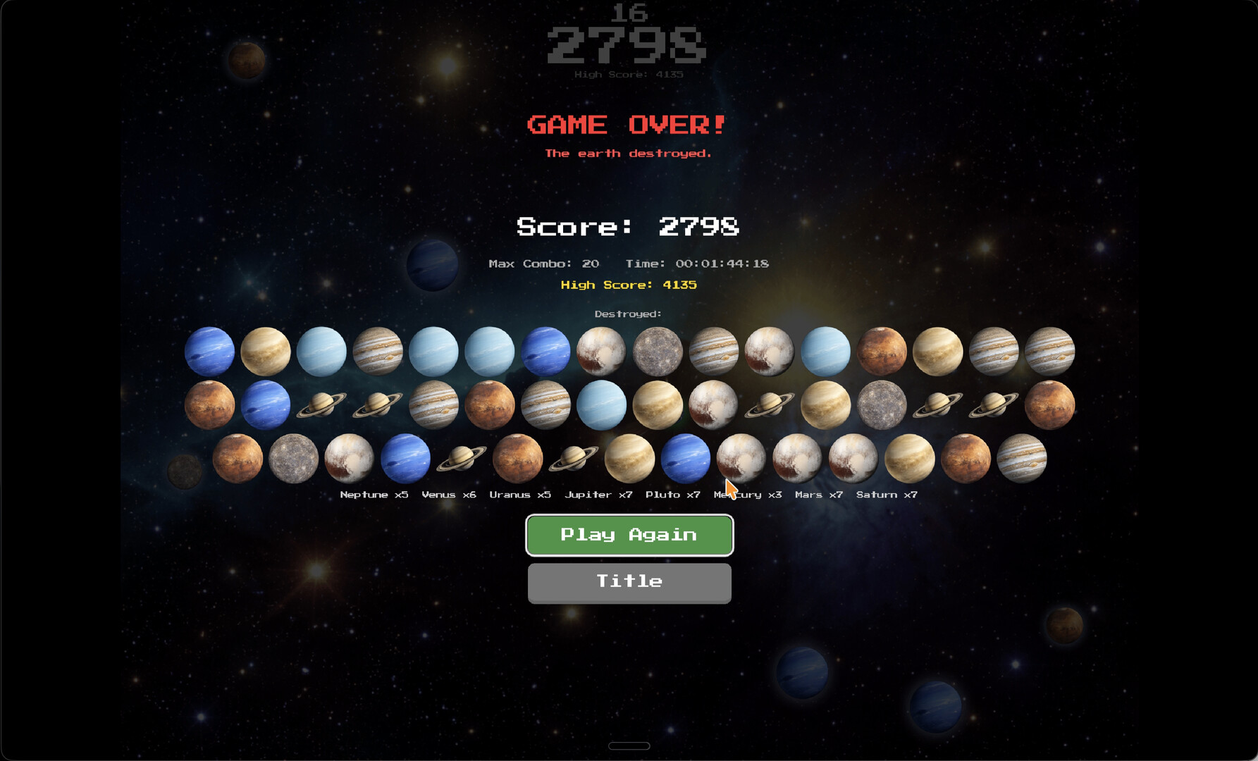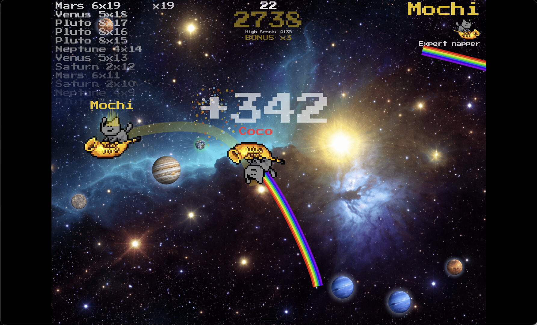 Bend gravity. Sling asteroids. Smash planets. Control a tiny Earth with real gravitational pull, curving asteroids into enemy planets for chain combos. Switch to Cat Mode for nyan-powered chaos, or Chaos Mode where defeated cats pile up on screen. Simple controls, deep physics.