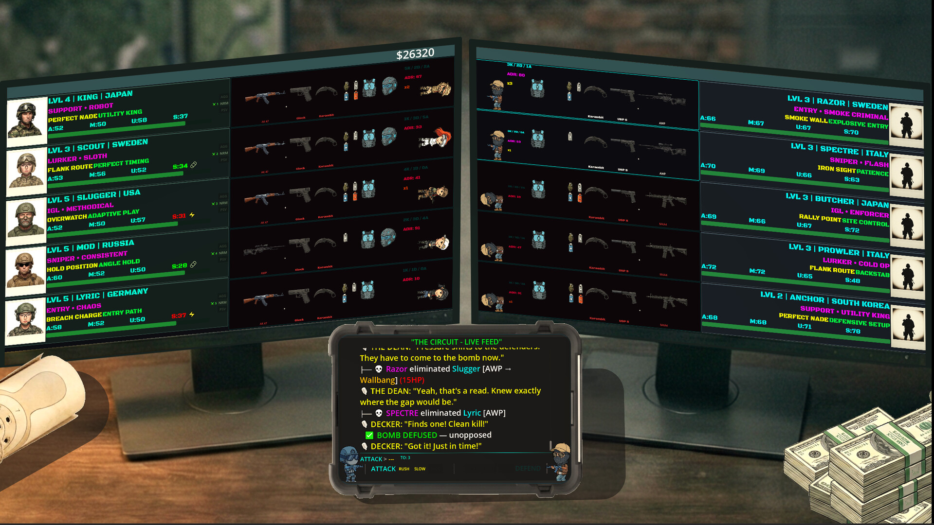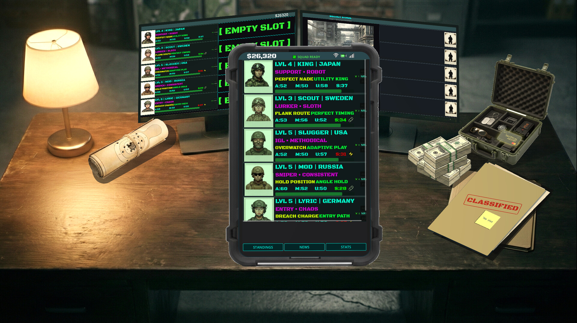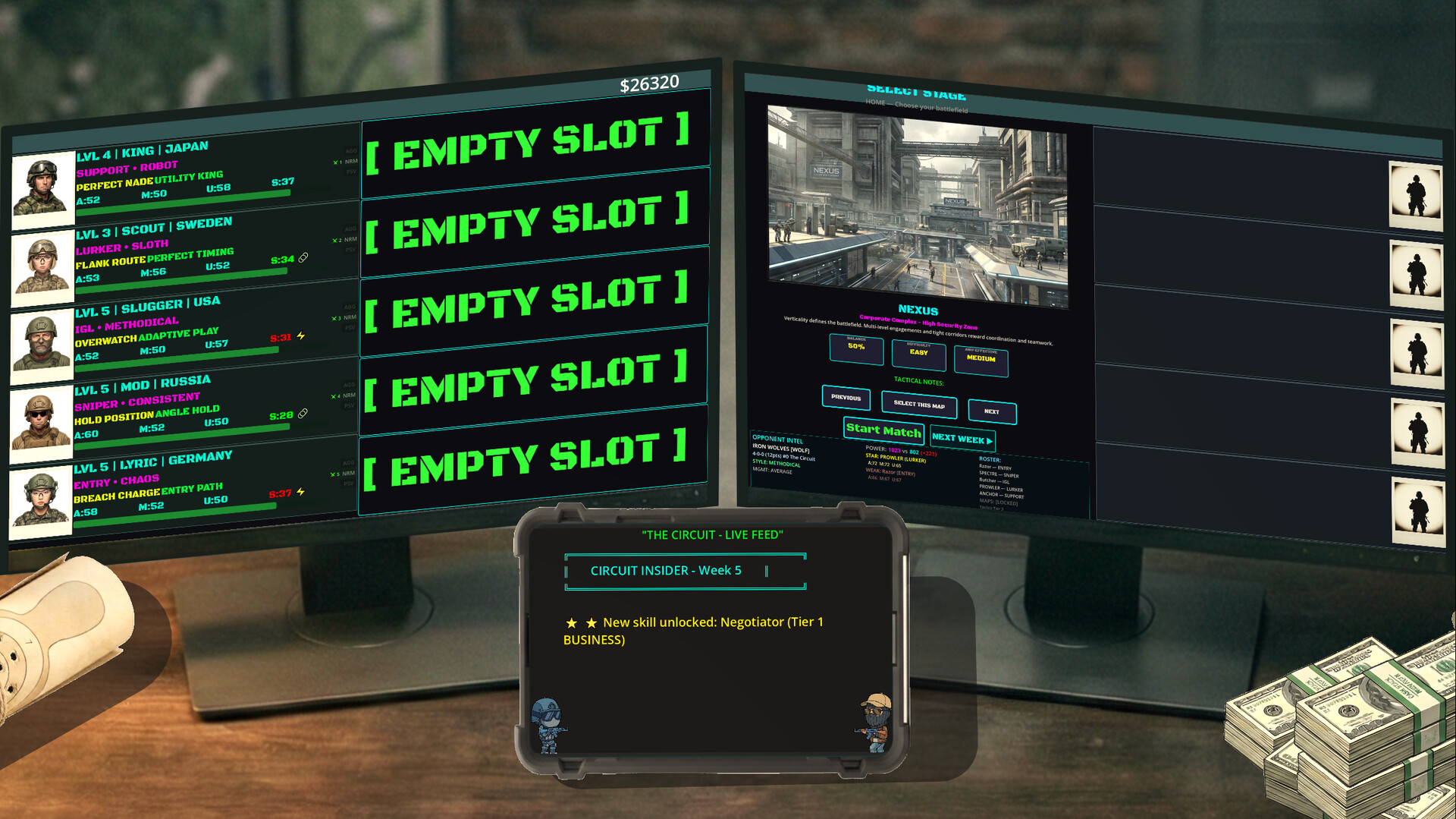You've been handed a Tessera — a ticket into an underground tactical combat league. Build your roster, manage the money, call the strategy, and fight for the championship from behind your broker's desk.