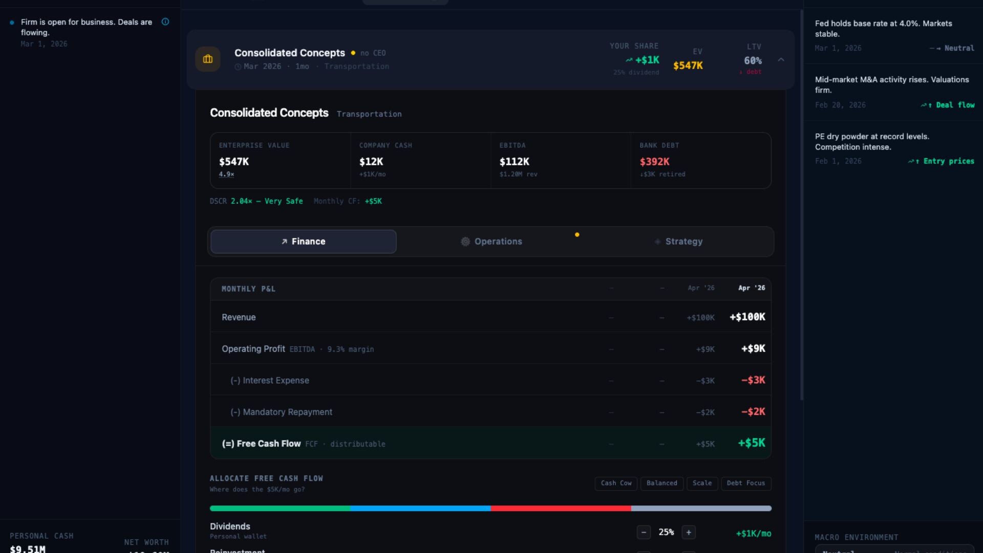The Capitalist is the ultimate hyper-realistic Private Equity simulator. Raise capital, execute Leveraged Buyouts (LBOs), restructure distressed businesses, and flip them for massive profits. Wall Street doesn’t forgive mistakes, but it pays handsomely for success.