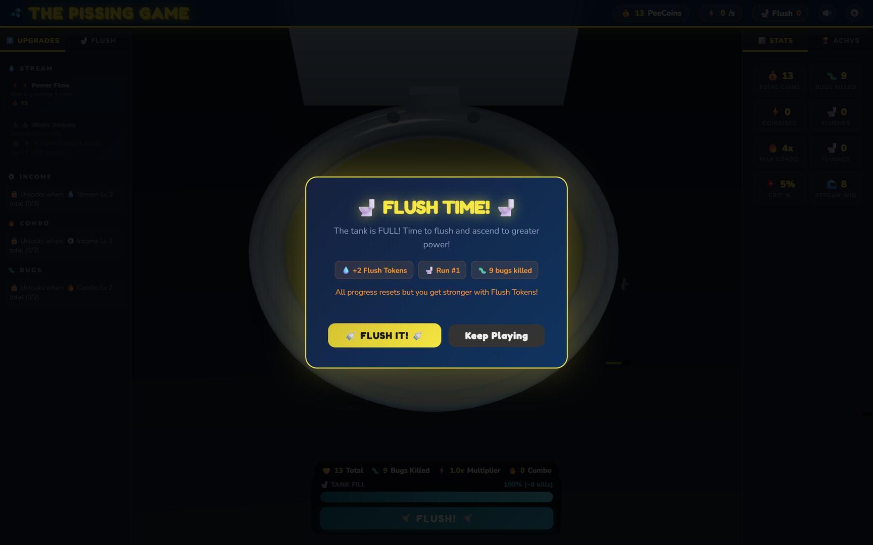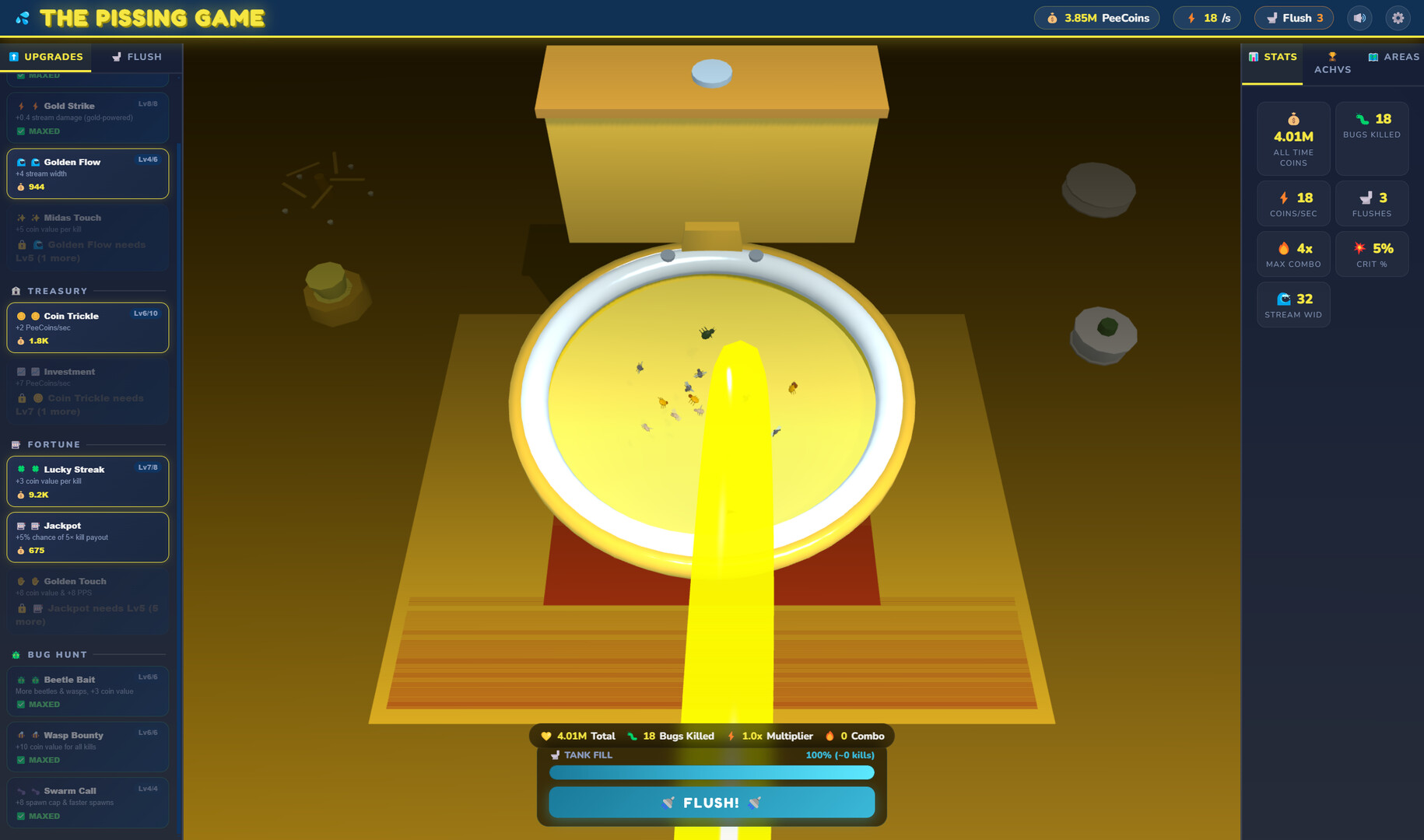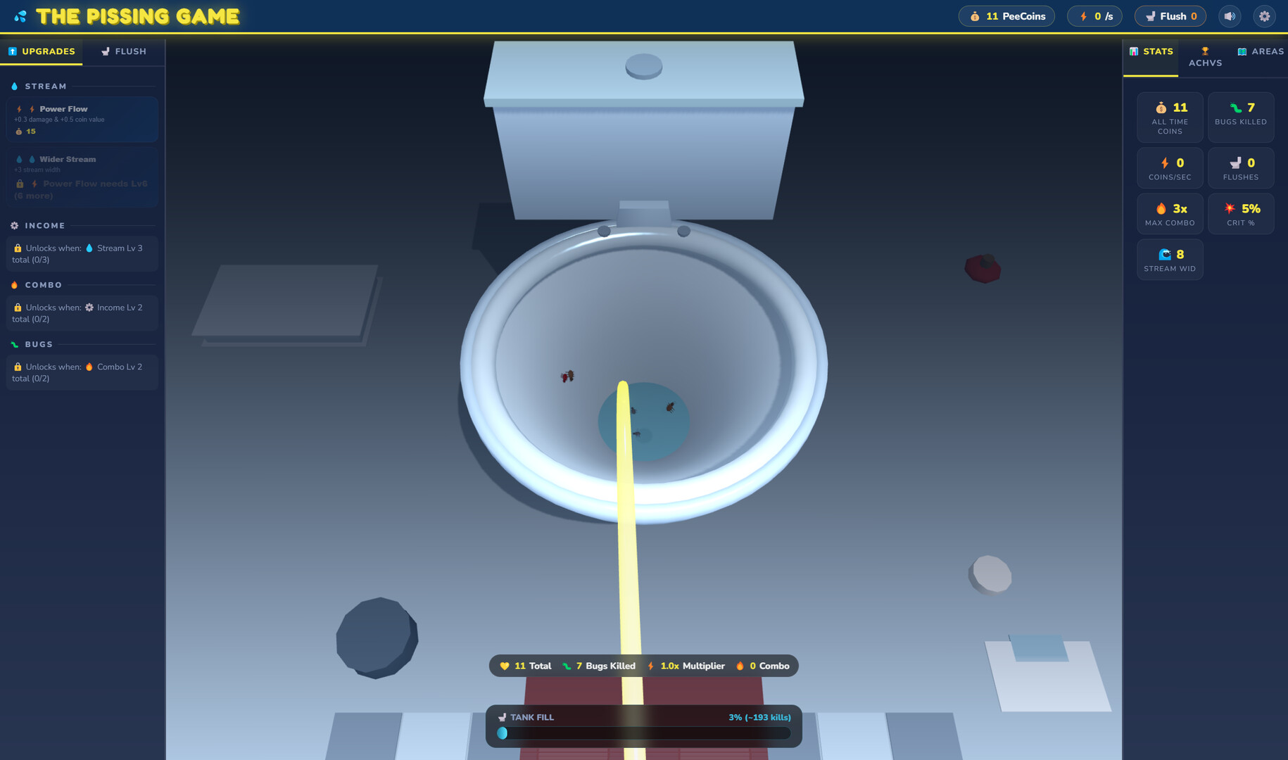 Step into a bizarre world where even taking a piss becomes a quest. Kill bugs, earn Piss-coins, upgrade, unlock hidden areas… and ultimately, flush.