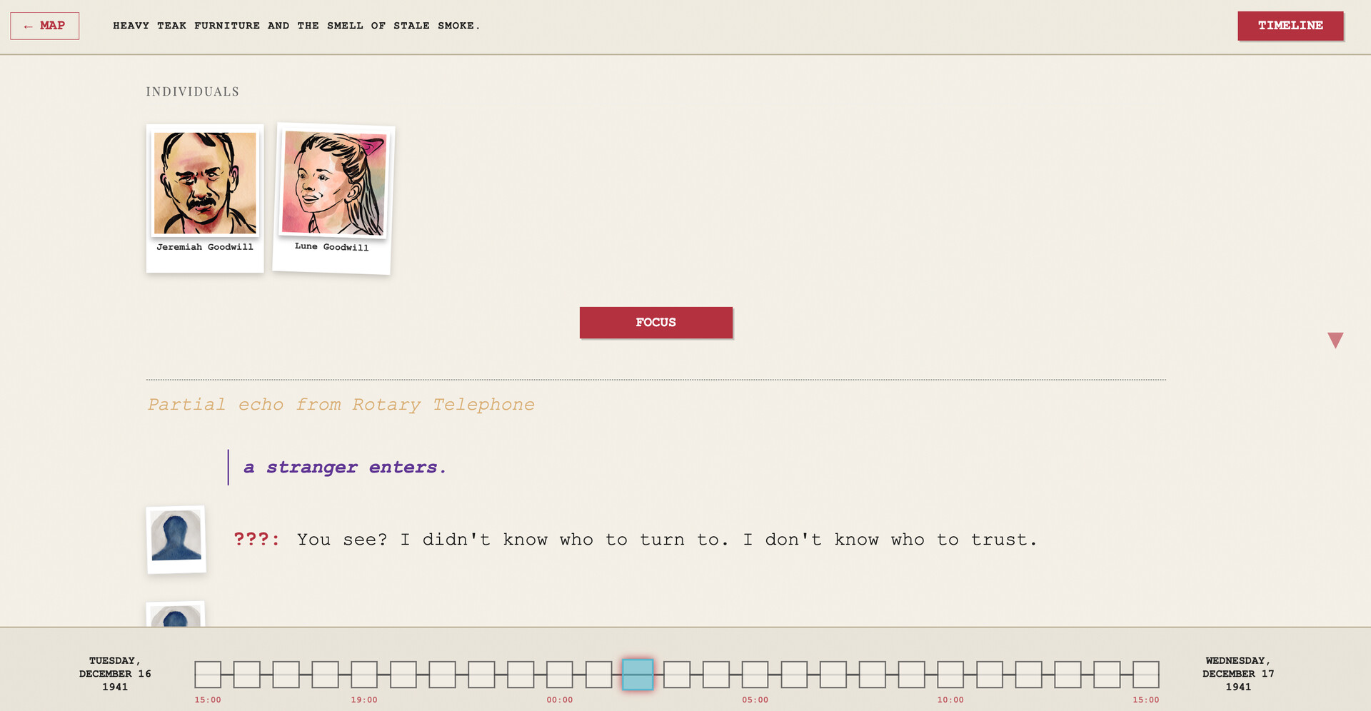 A detective noir puzzle deduction game. Explore a non-linear timeline as a clairvoyant investigator in 1941 Borneo. Jump between time and locations to uncover motives and discover what truly happened in the Goodwill tobacco plantation that fateful night on the eve of the WW2 Japanese invasion.