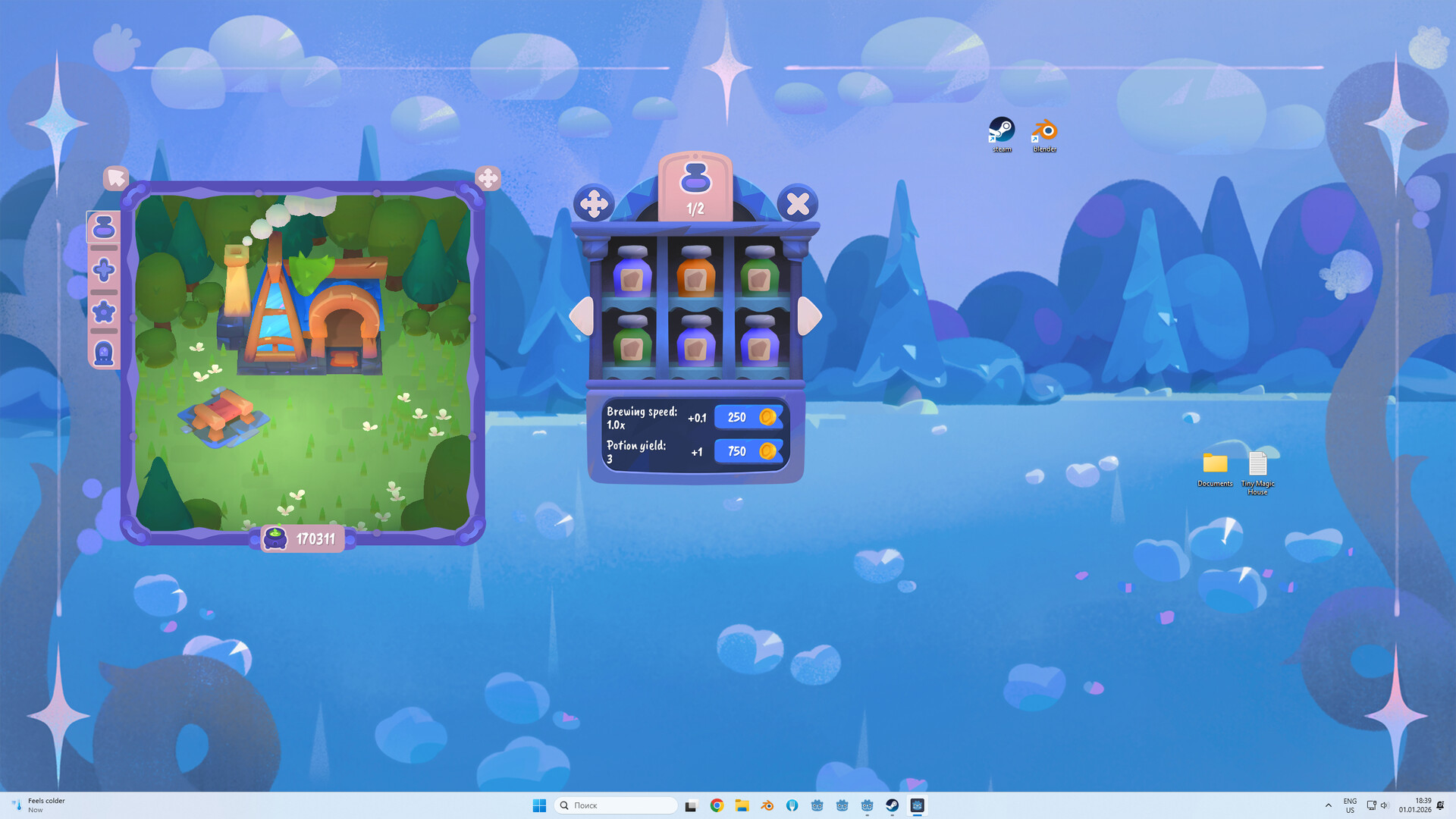 A cozy idle game that lives on your desktop. Watch a little witch-cat brew potions, fish by the pond, and decorate her tiny magical home while you work or relax.