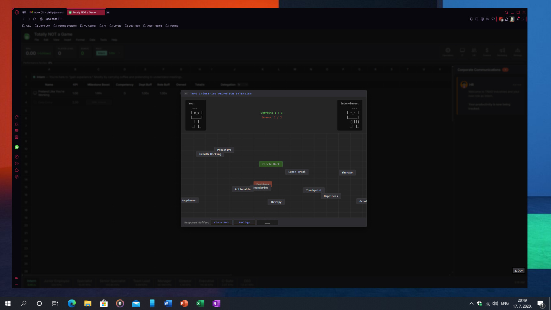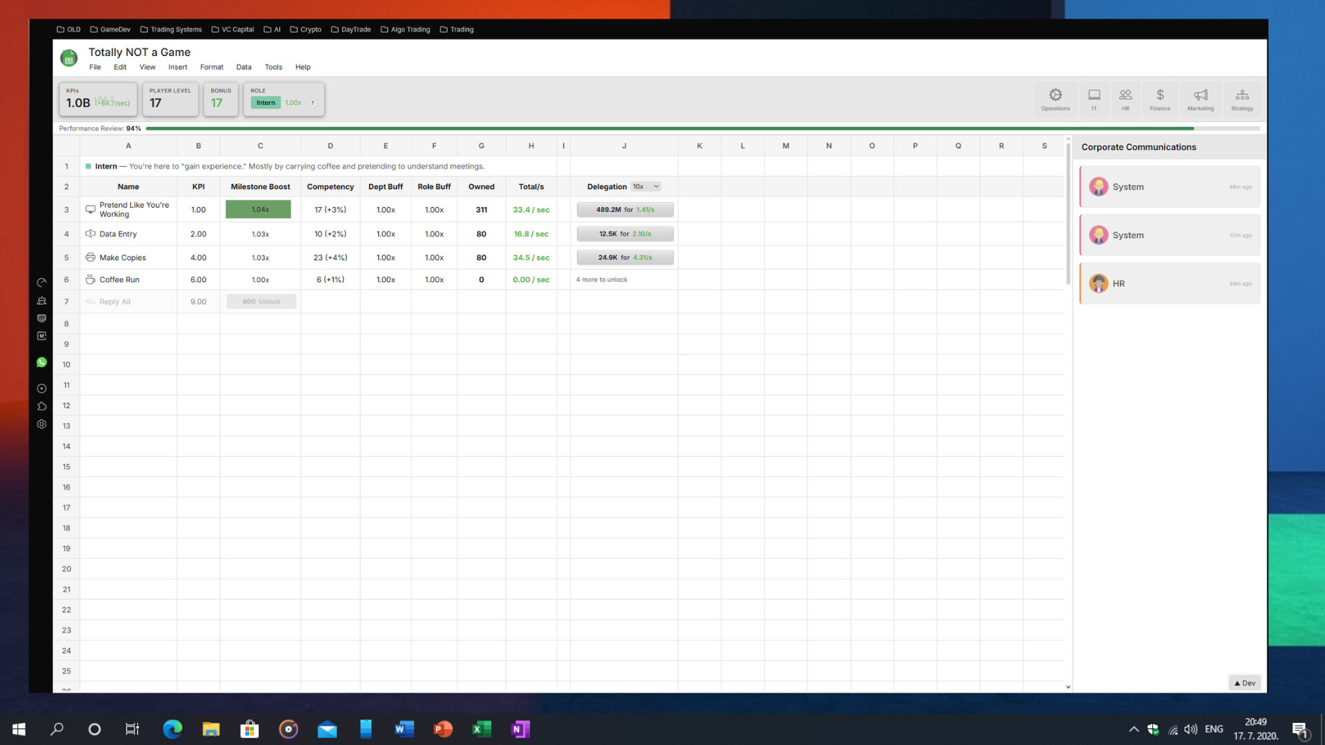 A corporate spreadsheet idle game where you climb the ladder from Intern to C-Suite by generating KPIs, automating busywork, and satisfying a Board that demands exponential results. Totally NOT a Game.