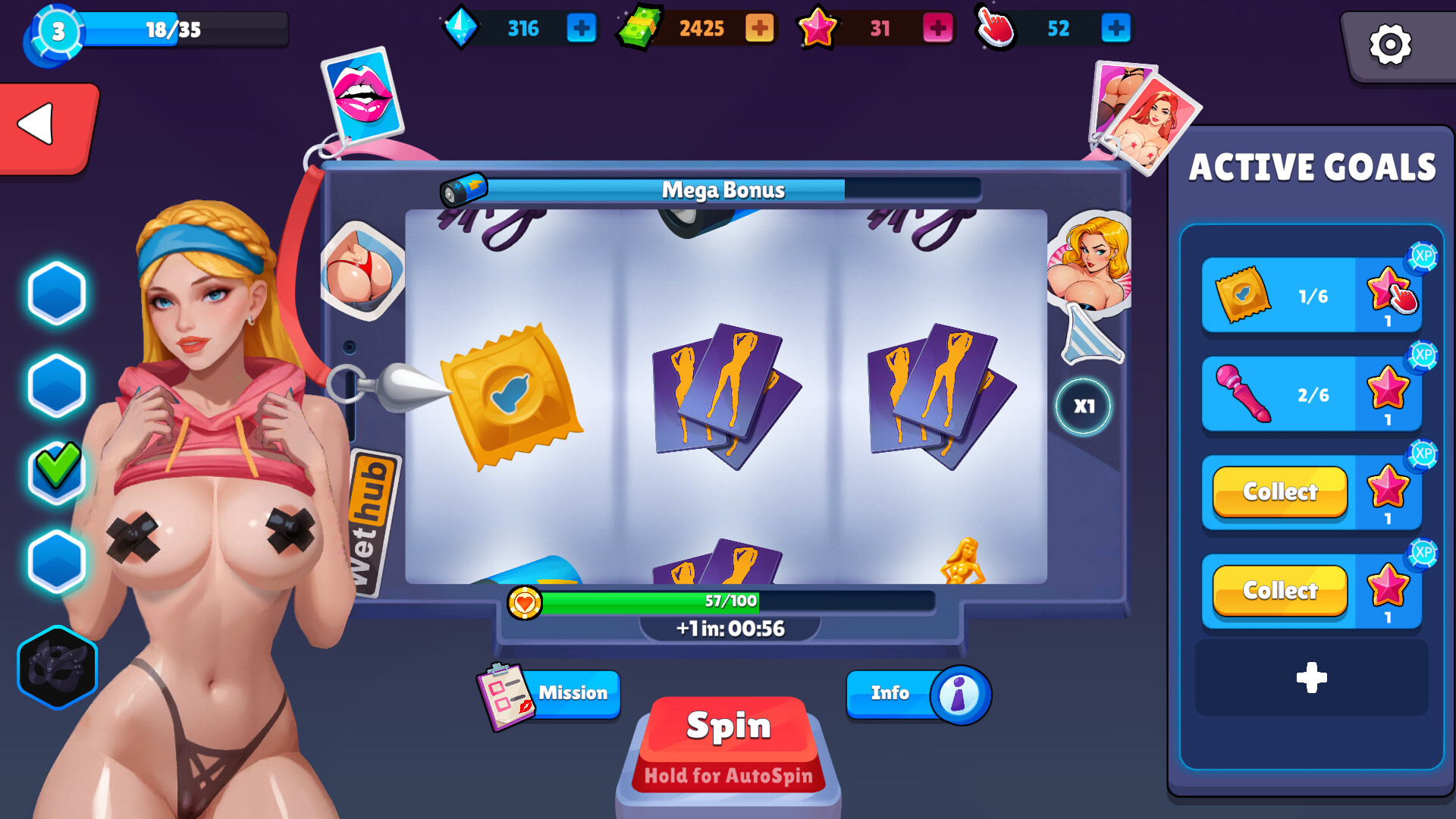 Casual casino slot + adult visual novel. Spin reels to collect items, finish quests, earn gold and crystals, and renovate a luxury penthouse. Upgrade girls to unlock new outfits, story chapters, and fully animated intimate scenes.