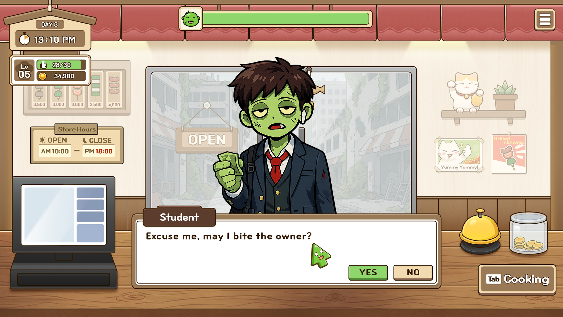 A bright and cozy casual tycoon! Grill skewers for hungry zombies, fulfill orders, and upgrade your shop to become the best spot in town. Don't miss special orders! Unlock recipes to boost your reputation. Enjoy cute customer reactions with simple controls anyone can play.